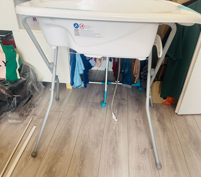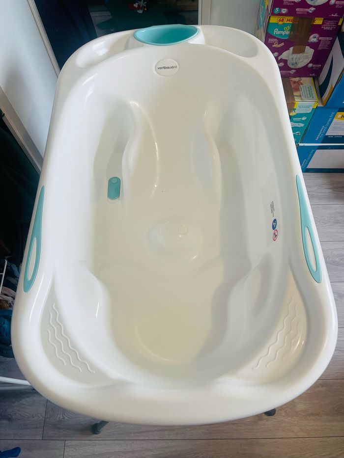 Baignoire bébé vert Baudet en parfait état Utilisé pour une dizaine de bain à peine En parfait état comme neuve Vendue avec les pieds Prix neuf 87€ Descriptif vert baudet : « C'est LA première baignoire de bébé ! Ergonomique, confortable, astucieuse avec ses nombreux rangements, la baignoire Cooltub intègre même un transat de bain ! Bébé y sera comme un poisson dans l'eau... SES ATOUTS Forme ergonomique spécialement adaptée à la morphologie de bébé Espaces de rangement intégrés pour le savon et les accessoires de toilette Bouchon de vidange intégré (tuyau inclus) Transat de bain intégré Permet une consommation d'eau réduite : la quantité d'eau préconisée pour un bain est de 12 litres (soit 10 cm de hauteur) Pieds de baignoire vendus séparément, (référence 70340-0041) CE QU'IL FAUT SAVOIR Dès la naissance et jusqu'à 1 an Dimensions : 96 x 52 x 25 cm. S'installe dans tout type de baignoire familiale, de bac à douche S'adapte au pied de baignoire vendu sur notre site, pour laver bébé à bonne hauteur 100% polypropylène facile d'entretien »