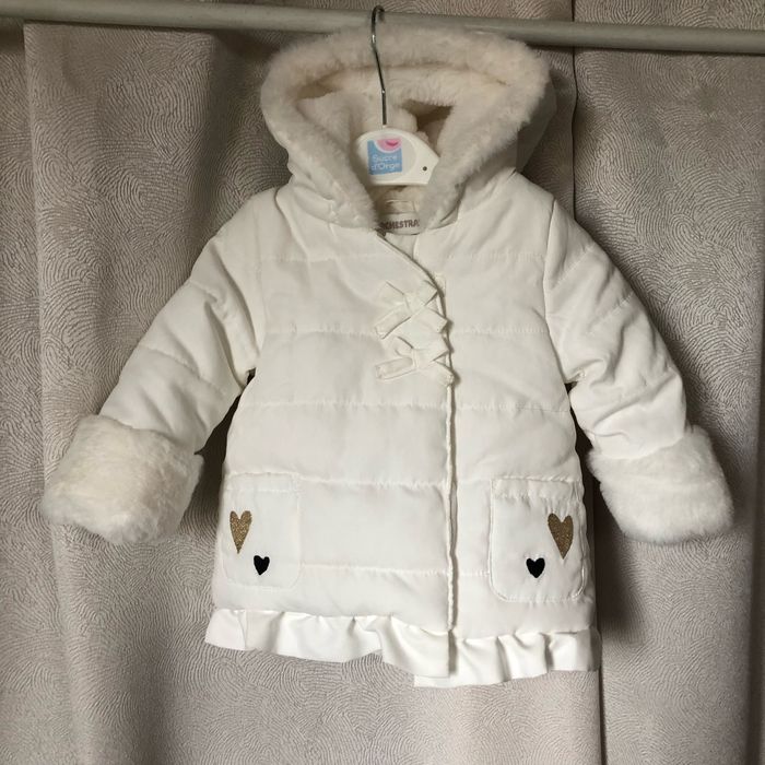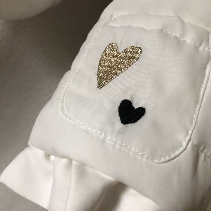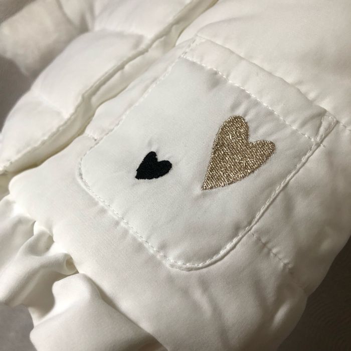 Très joli manteau à capuche, doudoune blanc Cassé comme neuf Cœurs sur les poches brodés or ou noir Intérieur fourrure hyper douce Taille 3 mois 60 cm Orchestra