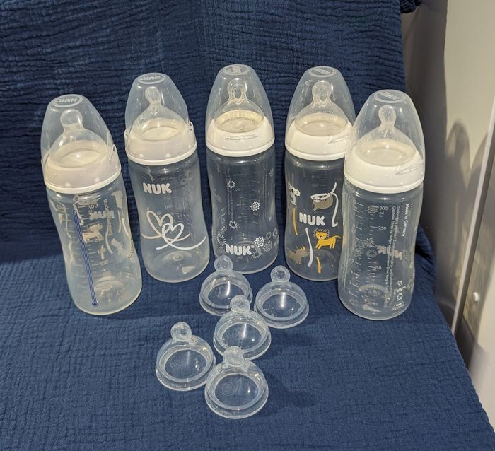 Lot de biberons Nuk, 5 biberons taille 300 ml avec 2 tétines S, 6 tétines M et 2 tétines L En bon état, usure légère due au calcaire et à la brosse pour nettoyer les biberons (rayures). Stérilisés avant l'envoi.