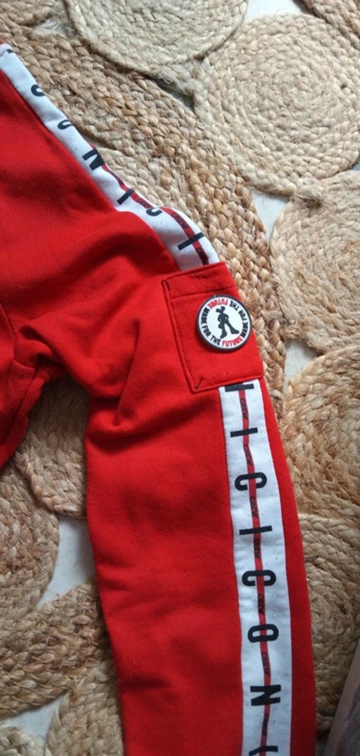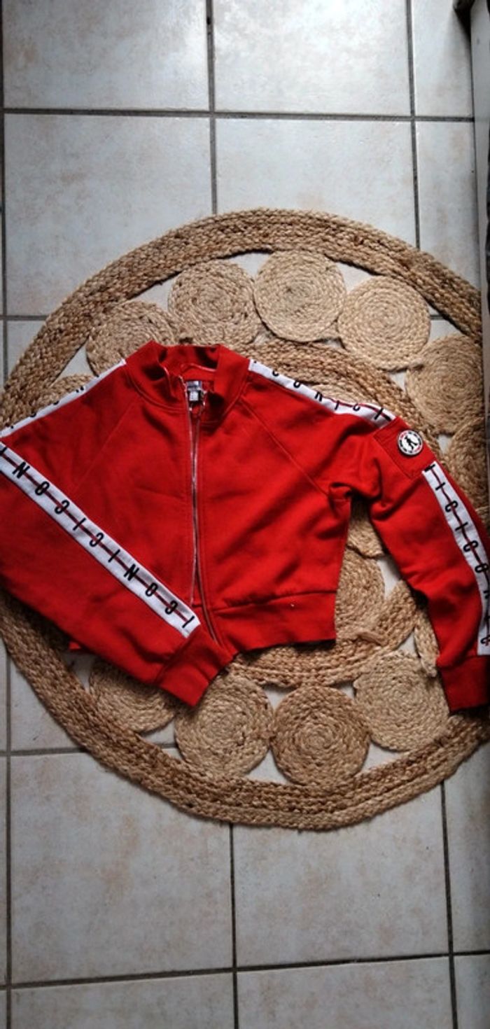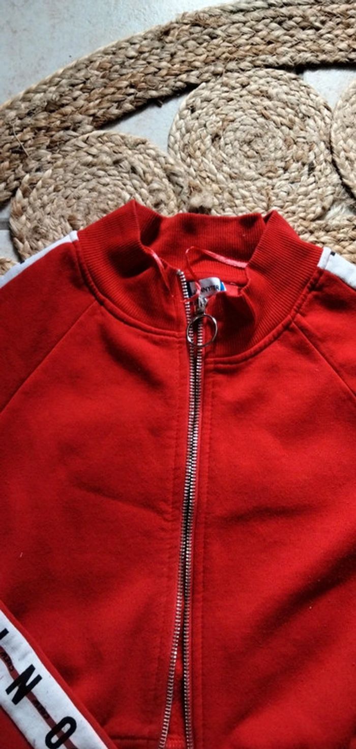 Gilet court à fermeture et des bandes sur les manches. En bon état.