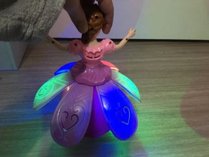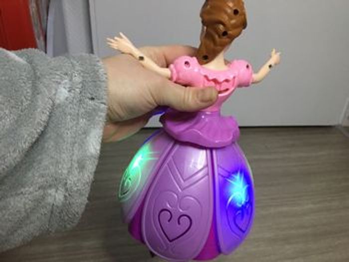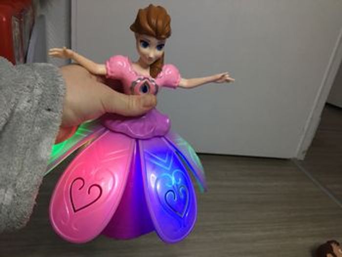 Musical, elle chante que le refrain « let it go » version anglaise de libérée, délivrée Lumineux, elle danse et elle tourne En bon état juste une lumière rouge qui ne s’allume pas ( voir photos) et il manque 1 doigt Prévoir pile