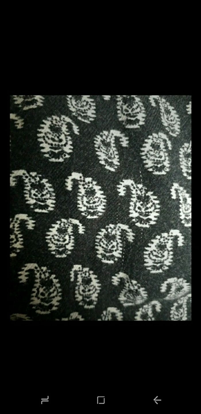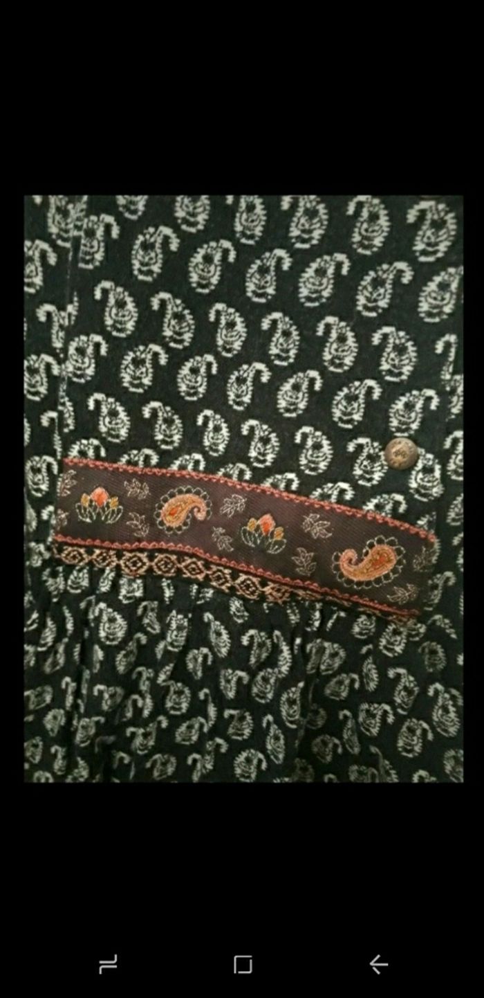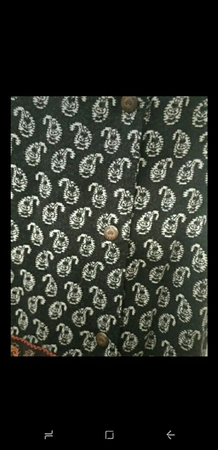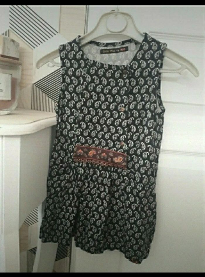 Taille 4 ans Se ferme par 3 boutons pressions Couleur noir et motifs blancs + motif coloré au milieu 2 poches Quelques fils tirés, voir dernière photo mais peu visible