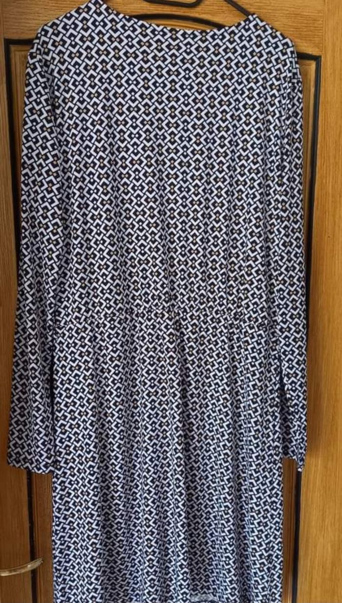 SOLDE -50% 🏷3,25€ FEMME 46 / XXXL N°1008 Robe imprimée Blanc , noir ocre Croisé , longue manche Elastique taille Longueur 104 cm 96% polyester, 4% elasthanne Taille 46 / xxxl Fpc 6,50€ #kelly_femmeT46