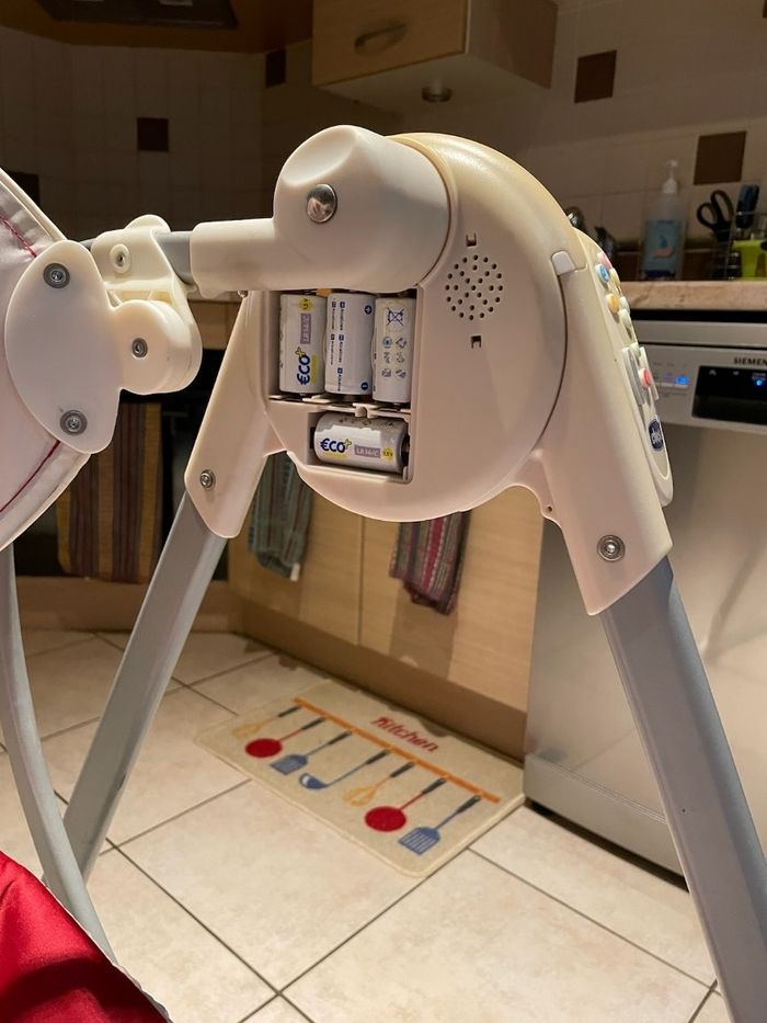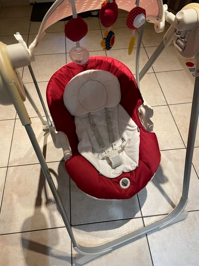 Vend balancelle de marque chicco, elle est en bon état fonctionne avec 4 piles LR 14 pour le mécanisme de la balancelle et 2 piles LR 20 pour le siège vibrant. Il manque le cache des piles et un arceau mais ne gêne en rien car l'enfant est attaché avec un harnais, le siège peut s'incliner sur plusieurs positions. Elle fonctionne aussi à distance grâce à sa télécommande.