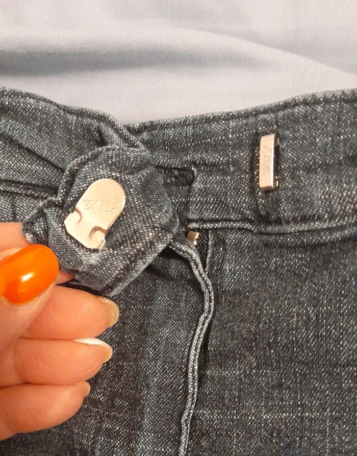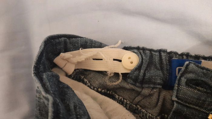 Pantacourt en jean. Les élastiques de serrage sont décousus et petite tâche sur une jambe (voir photo)