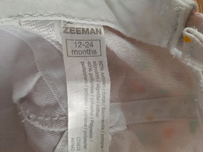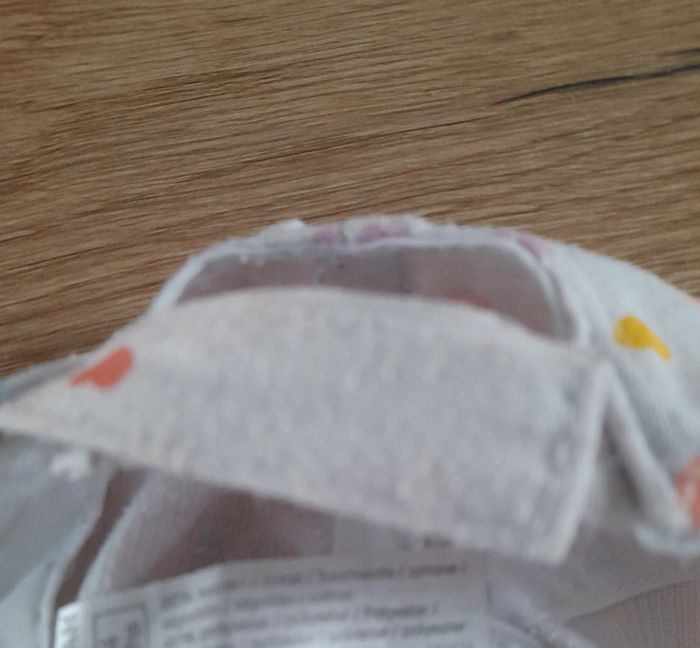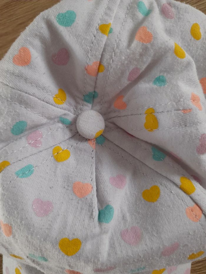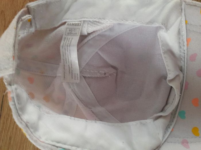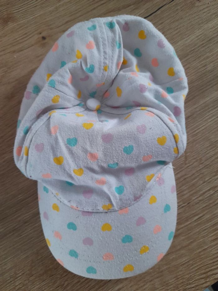 Casquette blanche avec petits cœurs colorés. Scratch derrière la tête.