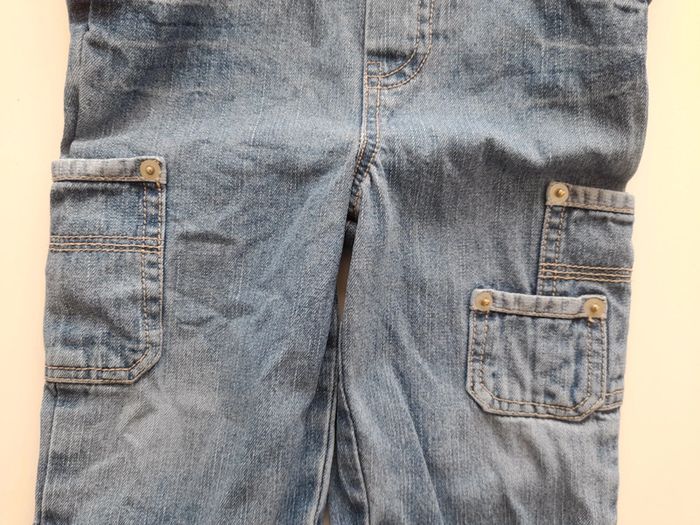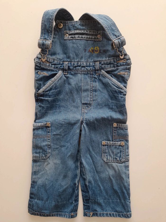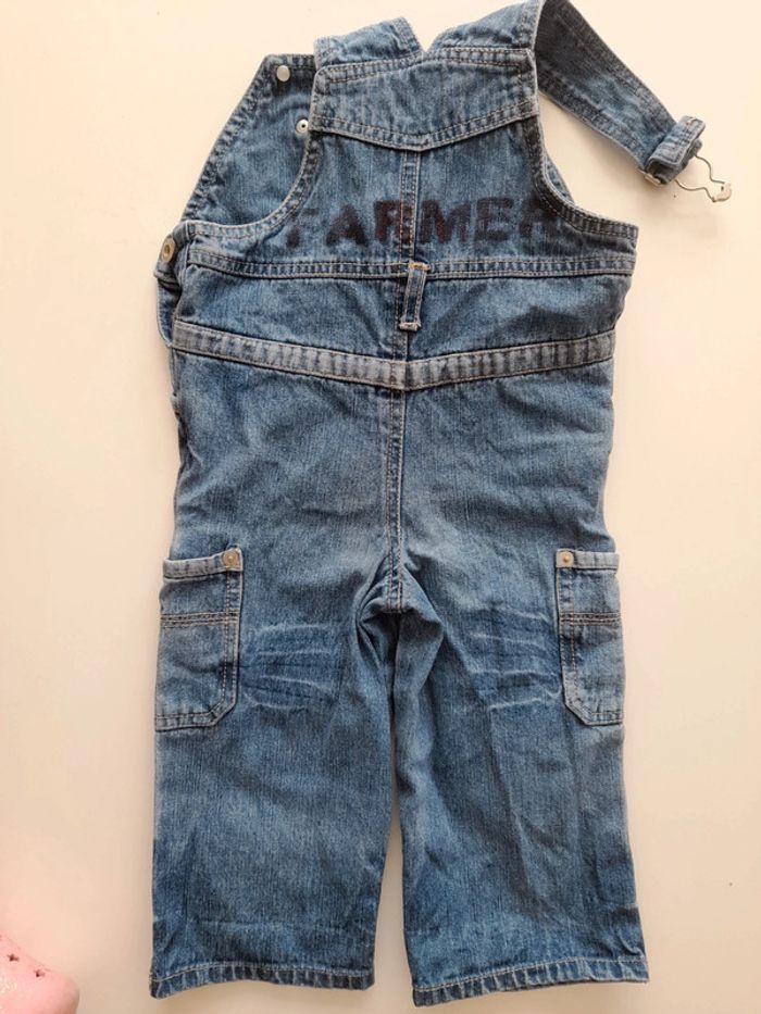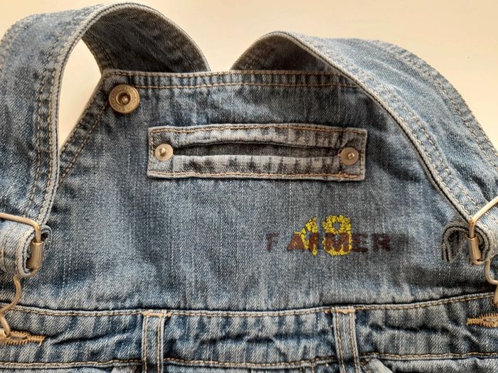 Salopette jeans. Inscription Farmer. 12 mois et un peu plus car les ourlets ont été défaits.
