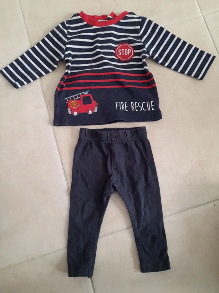 Ensemble garçon. Leggings bleu marine. T-shirt manche longue rayures avec motif camion de pompiers.