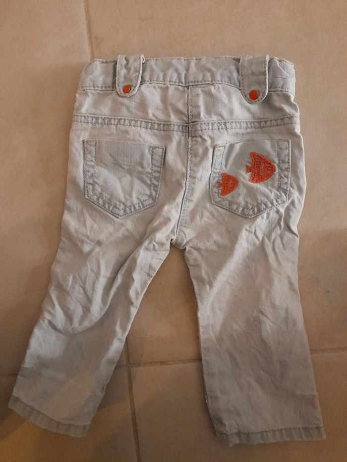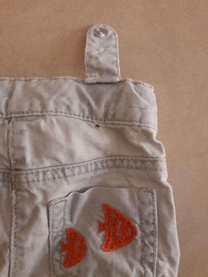 Pantalon jean. Motif poisson sur poché derrière. Un des passant derrière est défait (photo).