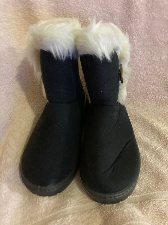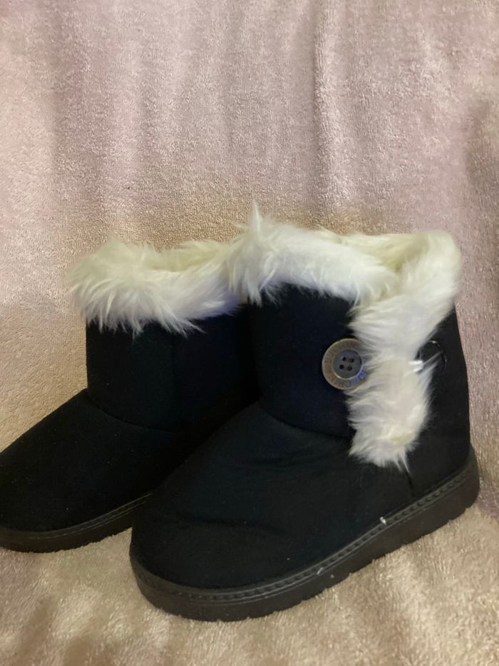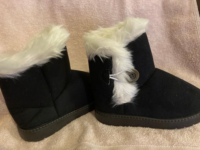 Boots fourrées Coloris noir avec fausse fourrure blanche Taille notée sur les semelles 31 mais chaussent vraiment petit pour moi on est plus sur un 28/29 Neuves jamais portées car trop petites pour ma fille Non négociable Envoi rapide et soigné