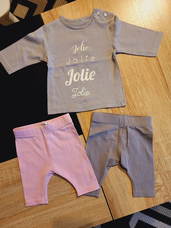 Ensemble 3 pièces Kitchoun. 2 leggings + 1 t shirt manches longues. Taille 1 mois. Très bon état.