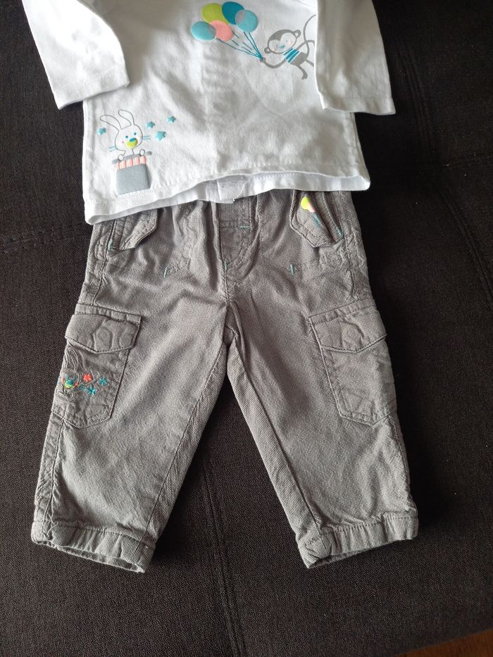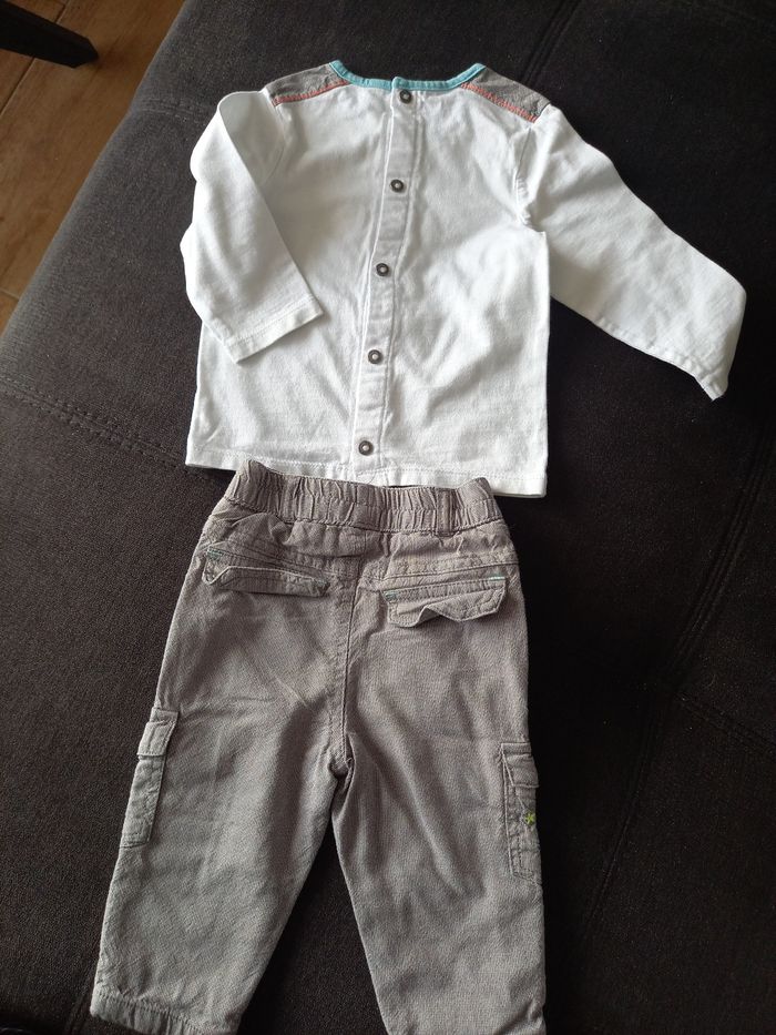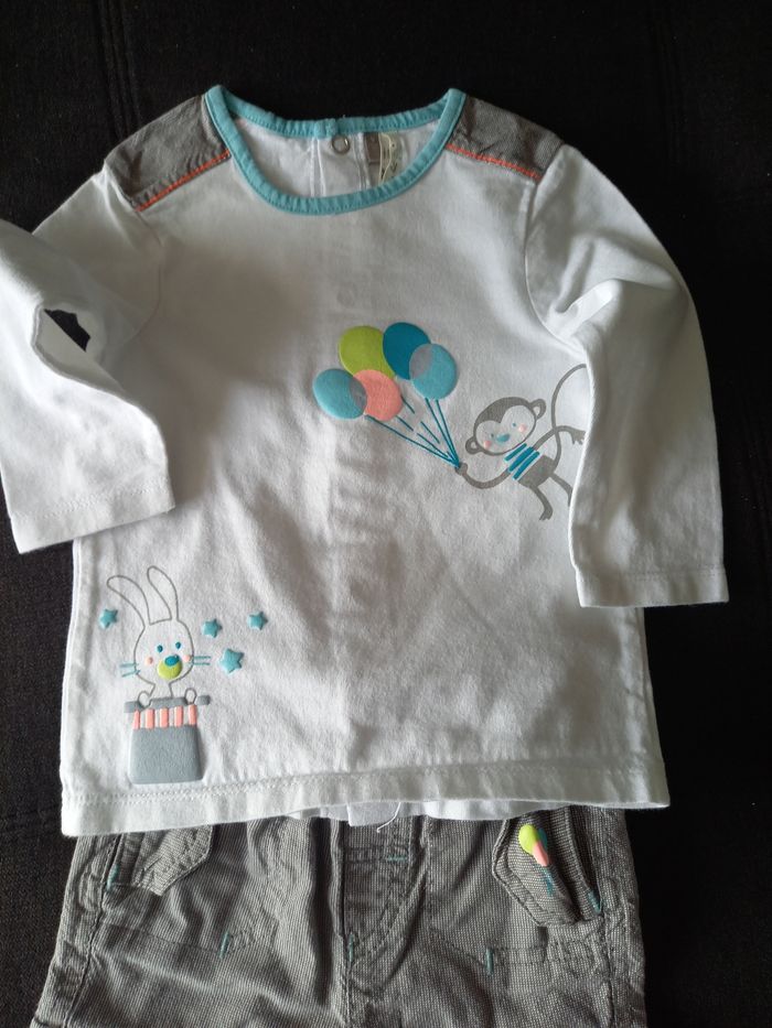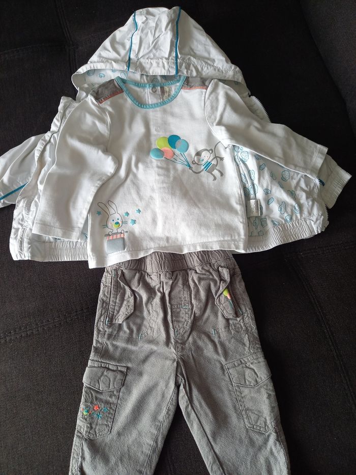 Ensemble de 3 pièces comprenant 1 pantalon légèrement doublé, 1 tee shirt manche longue boutonnage au dos et 1 blouson imperméable. Le tout en excellent état.