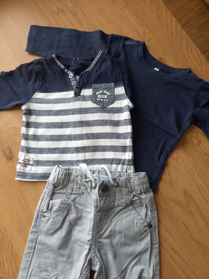 Ensemble de 3 pièces comprenant, 1 pantalon gris gemo, 1 tee-shirt ( le rayé) boutonnage au dos gemo et 1 tee-shirt bleu ( il est sans marque lui) avec un col large facile à mettre . Très bon état.