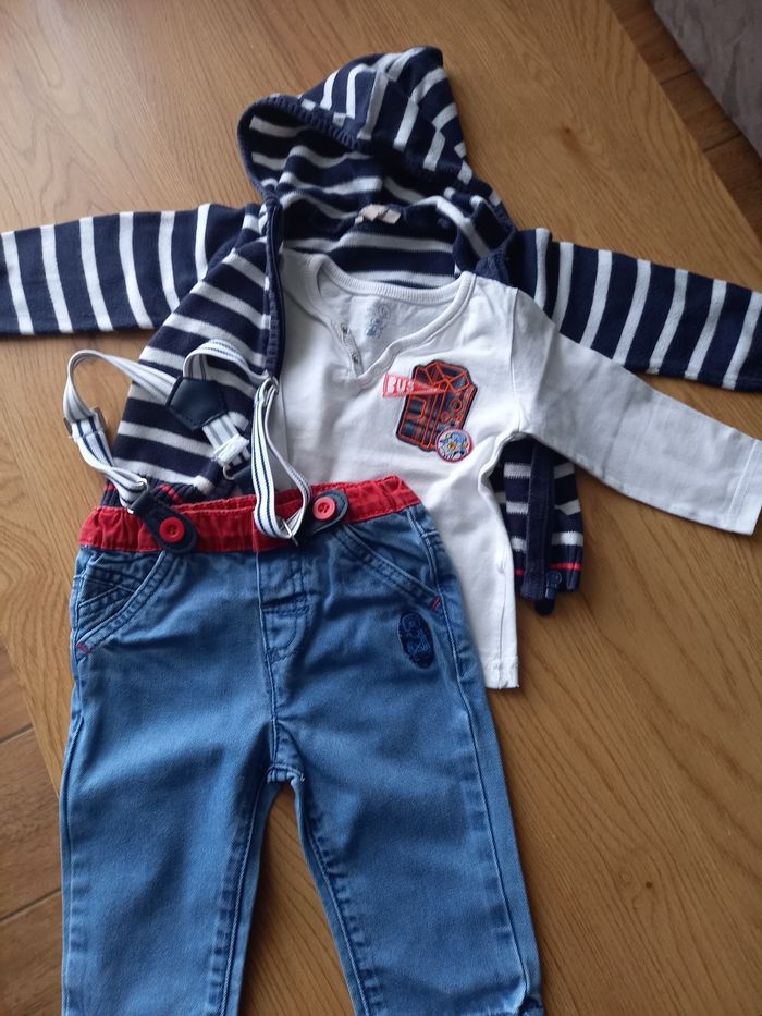Ensemble de 3 pièces sans marque comprenant 1 jean réglable à l intérieur avec des bretelles amovibles, 1 tee-shirt manche longue et 1 veste ( marque grain de blé) . Très bon état.