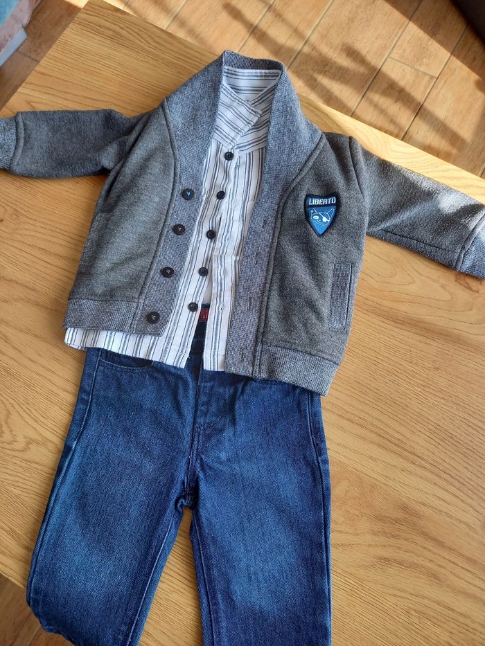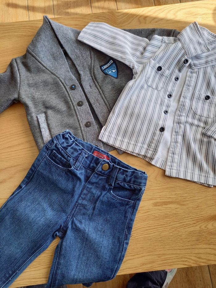 Ensemble de 3 pièces comprenant, 1 jean réglable à l intérieur Tissaia, 1 chemise en coton épais et 1 veste en coton Liberto. Très bon état.