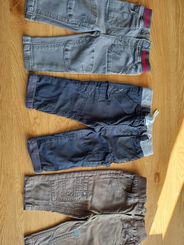 Lot de 5 pantalons comprenant : 2 pantalons Orchestra marron et gris clair 1 pantalon Gemo bleu foncé 1 jogging Kimbaloo gris clair épais 1 jogging Kimadi gris avec lien resserable Très bon état.