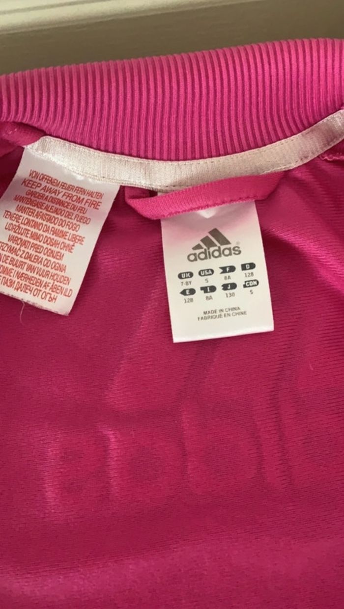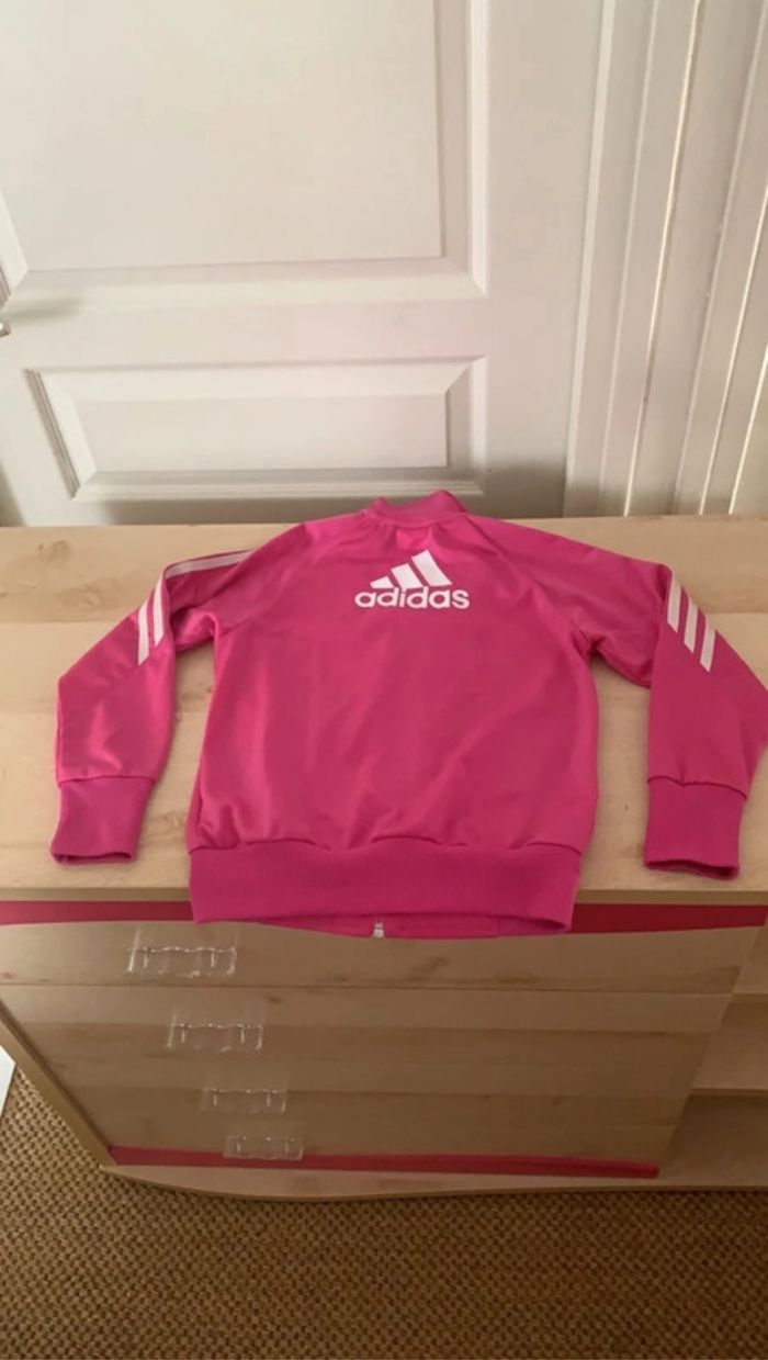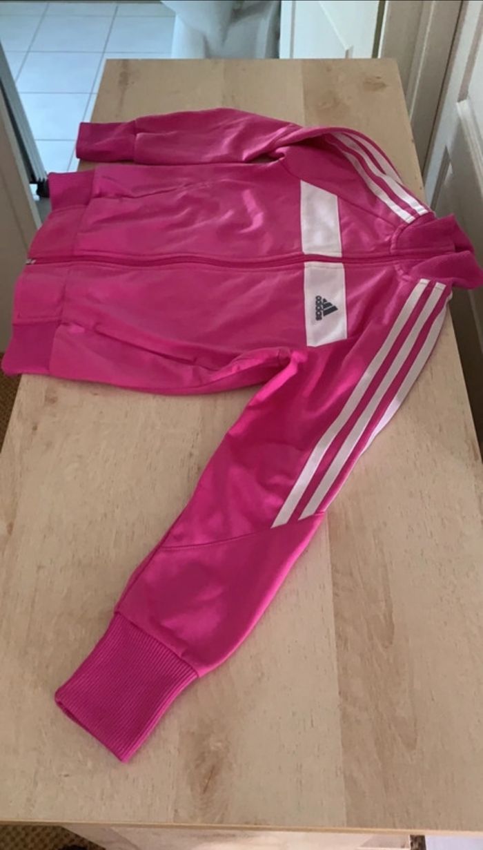 Veste adidas rose trop bonne état juste la fermeture qui bloque légèrement au milieux/ 8 ans