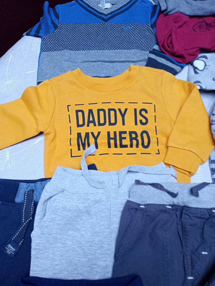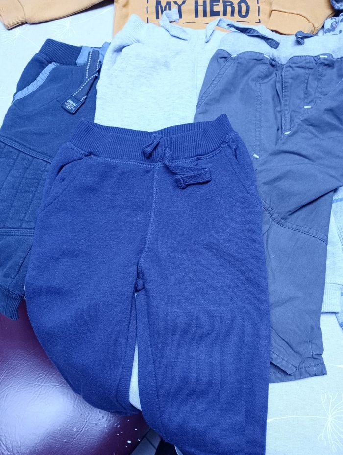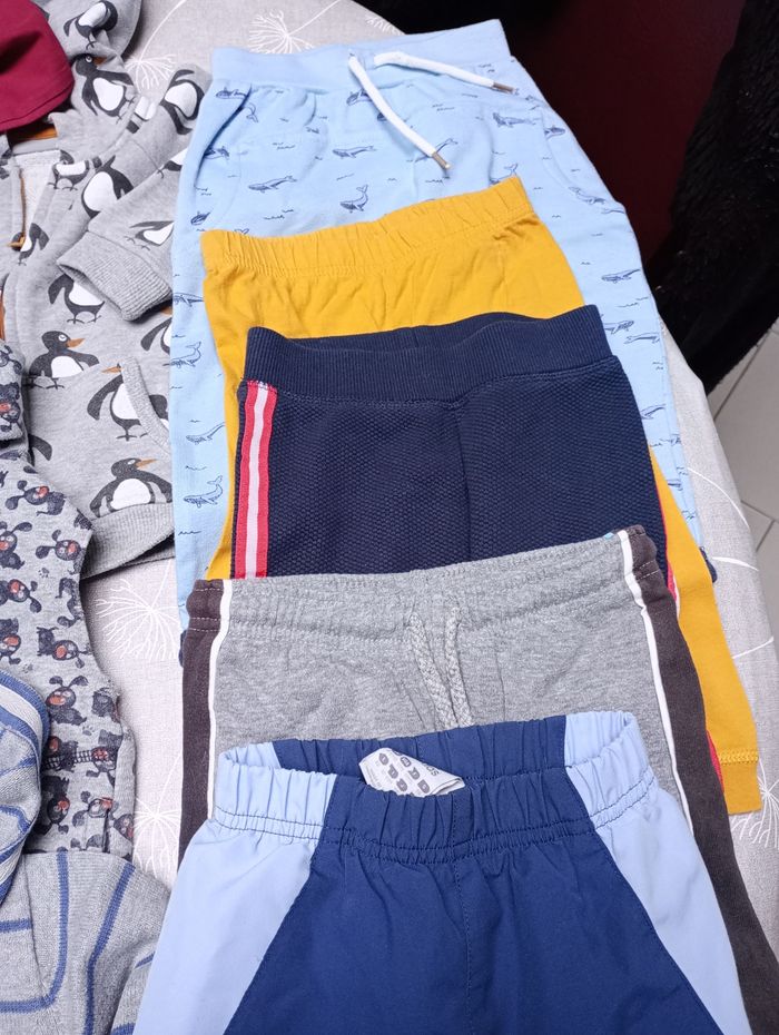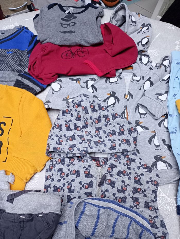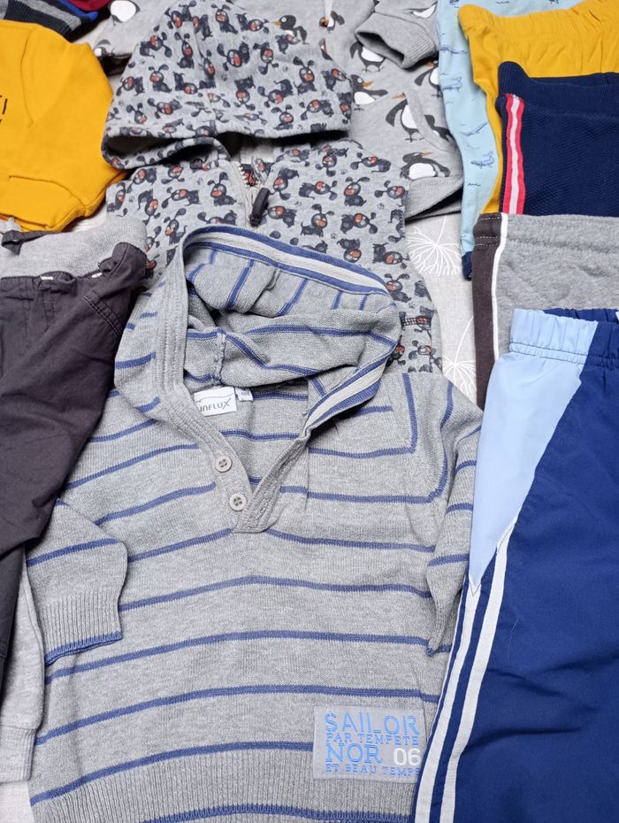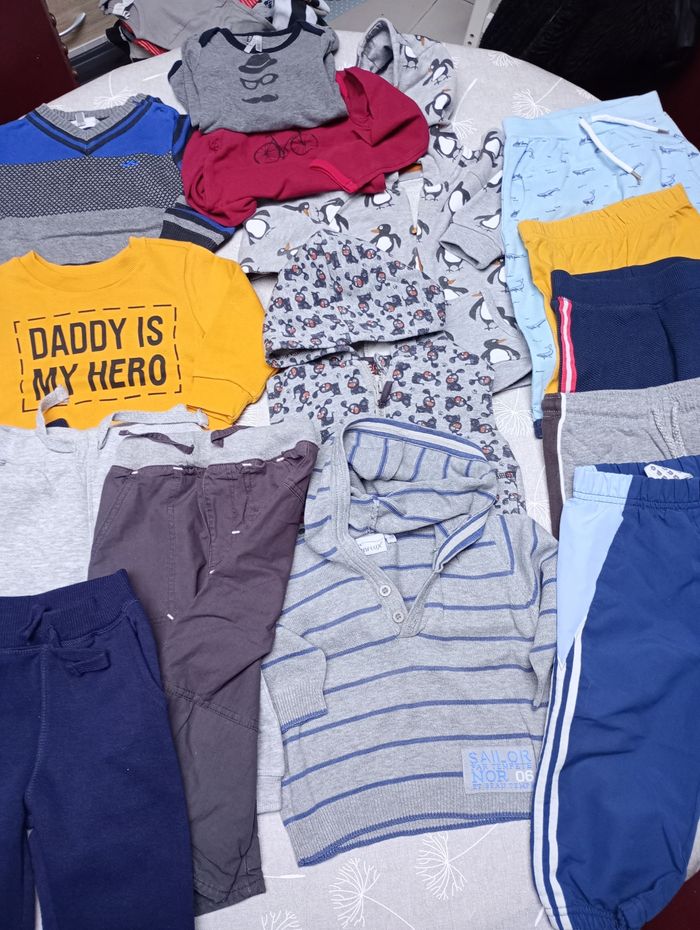 Gros lot de 16 vêtements en taille 80, 12 mois. Tout est en très bon état. Se compose de : 2 bodies longues manches 2 pulls sans capuche 1 pull à capuche sans manches 2 pulls à capuche 9 pantalons confortables et sans boutons. Marque : Adidas, Primark, JBC, Influx, Catimini, TQF... Bac 23