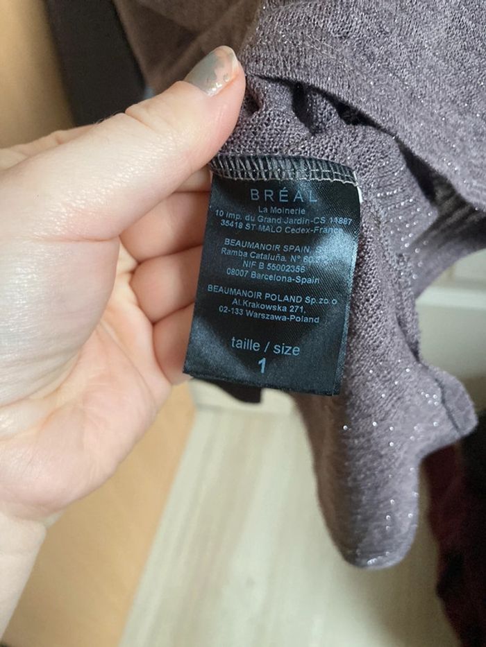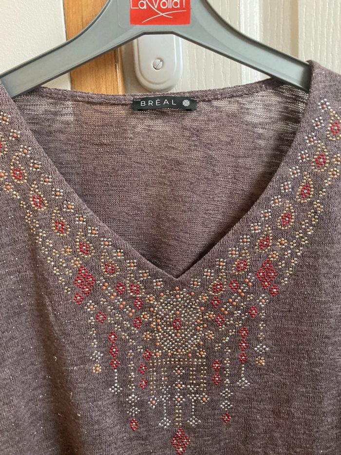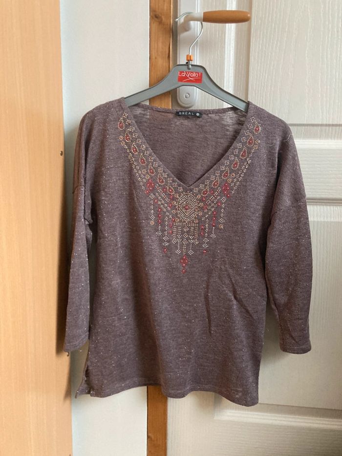 Pull fin manches 3/4 col V marron avec strass au col Bréal taille 36 En très bon état