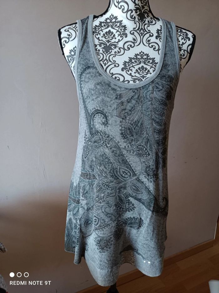 Tunique ou mini robe #boutiqueindépendante Elle est bien échancrée au niveau des bras Une bande avec des sequins en bas voir photo Elle est un peu transparente Très jolie avec un petit haut noir ou blanc Convient à toutes les tailles #deborahdubois1tailleunique