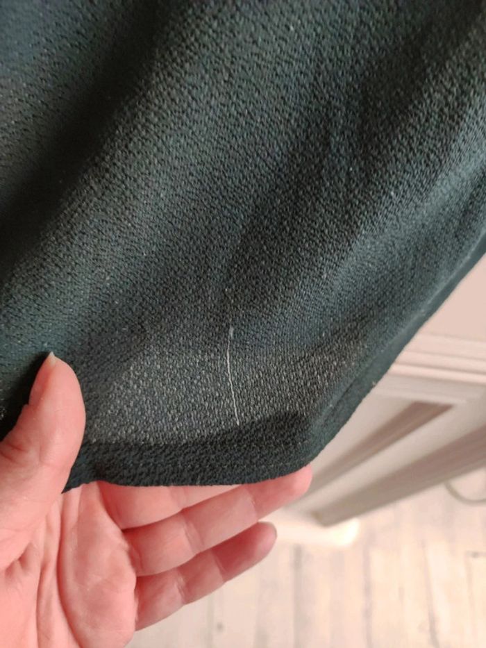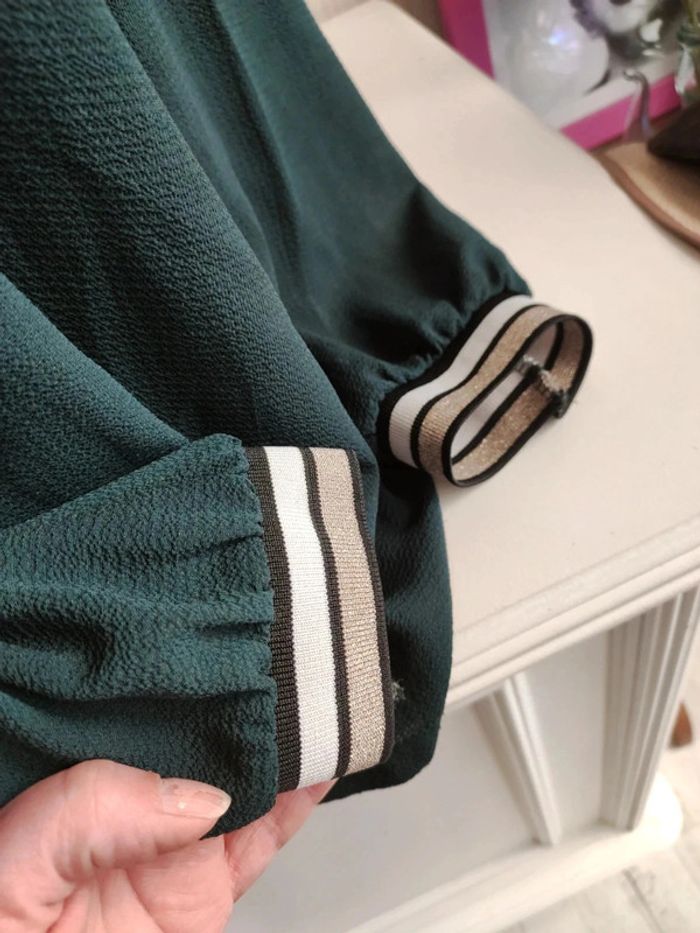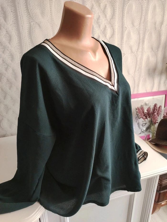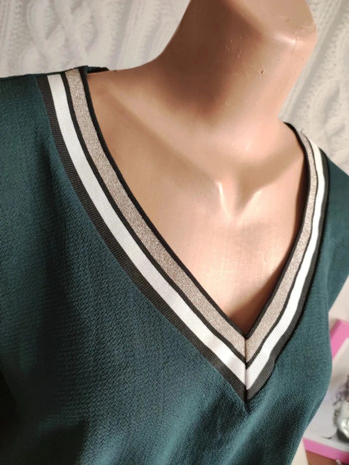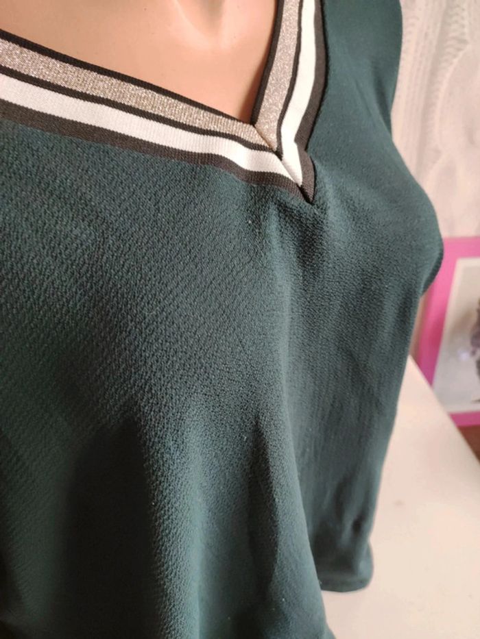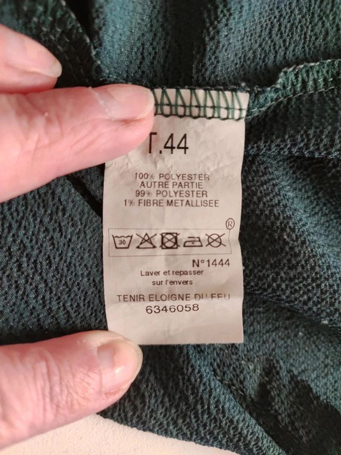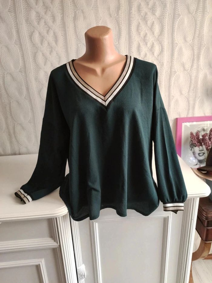 Blouse en bon état de couleur vert bouteille (pas forcément bien rendu sur les photos) col V avec bordure métallique dorée et blanc manche idem matière fluide 100 % polyester 1 % de matière métallique pour le col & manches Légèrement transparent fil tiré sur dernière photo sans doute dû au frottement d'un pantalon et d'une ceinture La validation de la commande se fait sous 14 jours après réception les lots sont possibles sur demande prix ferme #baronne44 #baronneligneasuivre #baronnepolyester