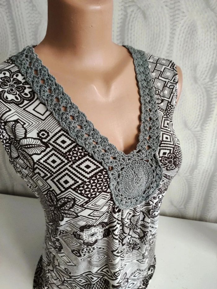Top avec col au crochet gris tissu 96 % viscose couleur marron et crème marque armand thiery taille 2. 36/38 Très bon état #baronne38 #baronnearmandthiery #baronneviscose