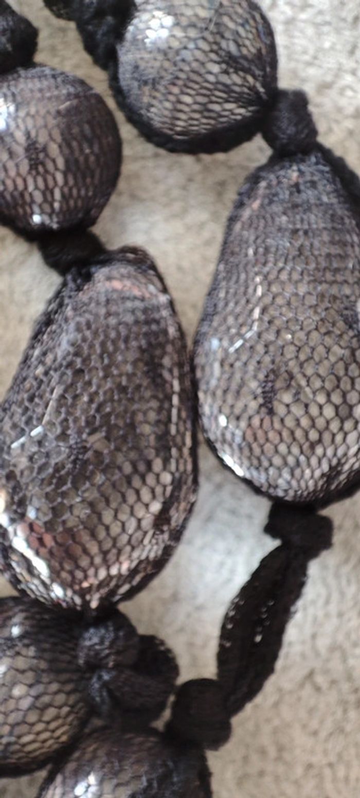 Collier original confectionné de perles dans un collant résille noir! Très original grosses perles transparentes pour un effet sympa (pas forcément bien rendu en photos). Totalement vintage ! La validation de la commande se fera sous 14 jours après réception Les lots sont possibles sur demande #baronnecollier #collier #vintage #resillenoir