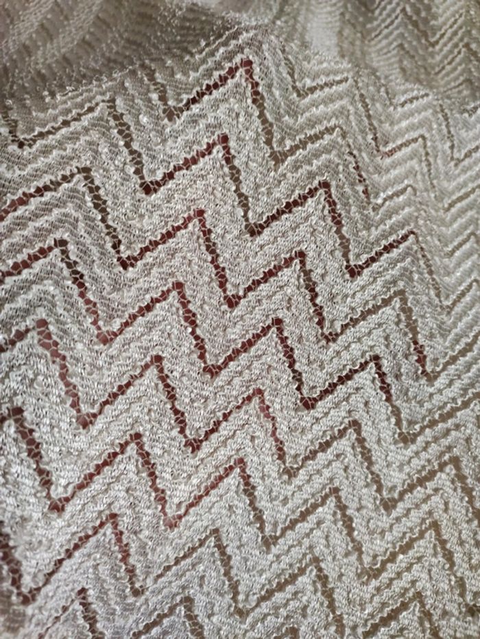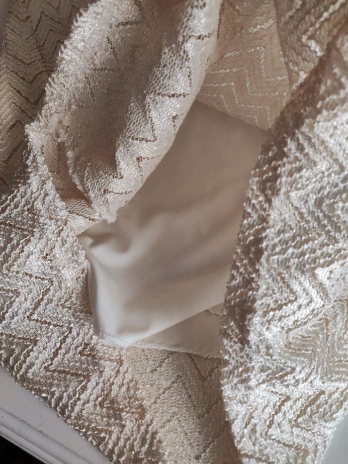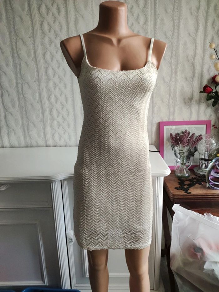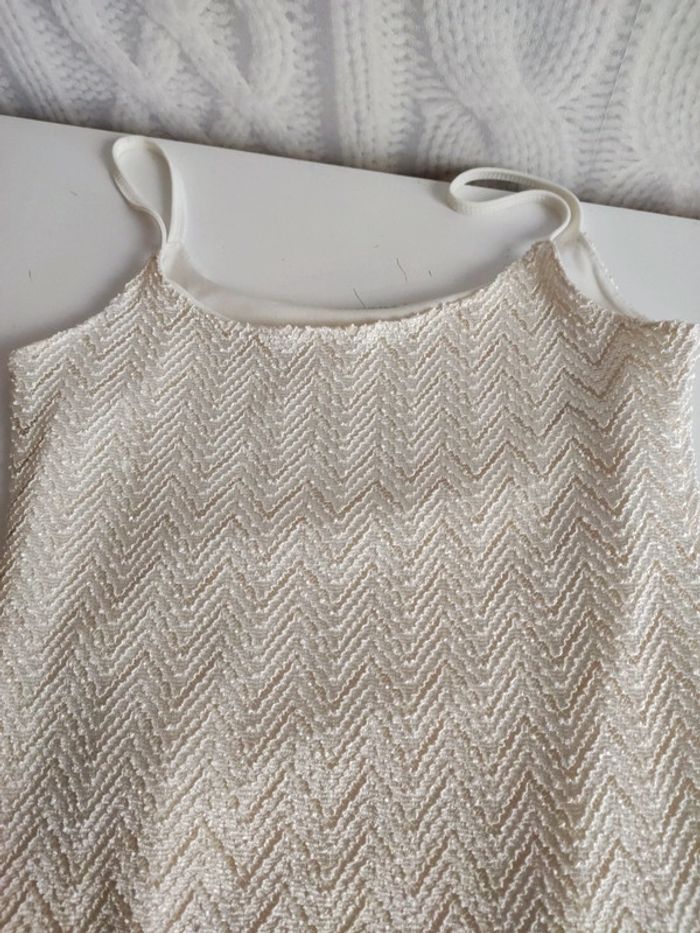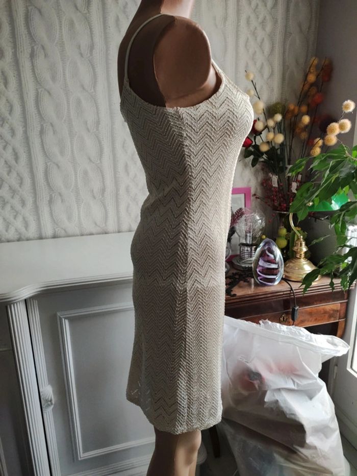 Magnifique robe moulante blanc crème avec tissu brillant chevrons très bon état vous serez clairement la reine de la soirée avec cette robe longueur 86 cm SL à SL 37 cm Tissu chevrons transparent mais avec bonne doublure Aucune indication de taille, ni de matière. Estimée à une taille 36 Bretelles non réglables La validation de la commande se fera sous 14 jours Les lots sont possibles sur demande Prix ferme #baronne36