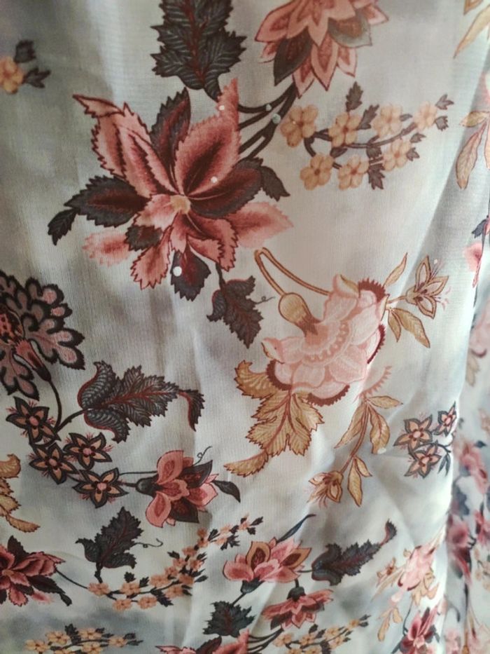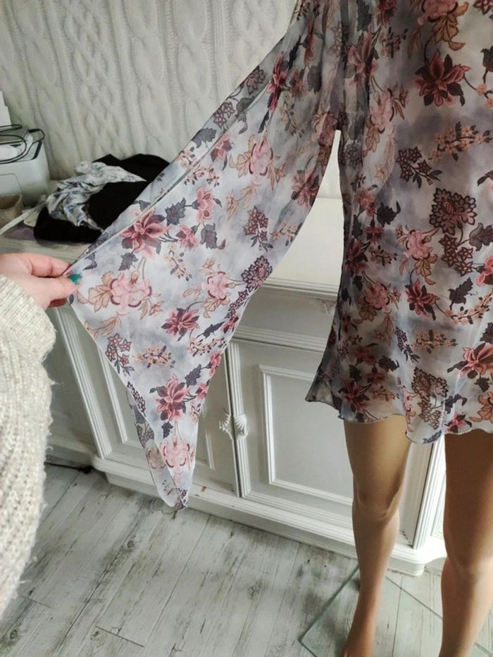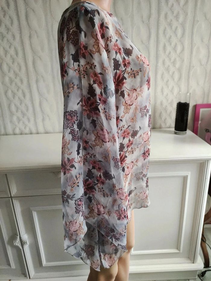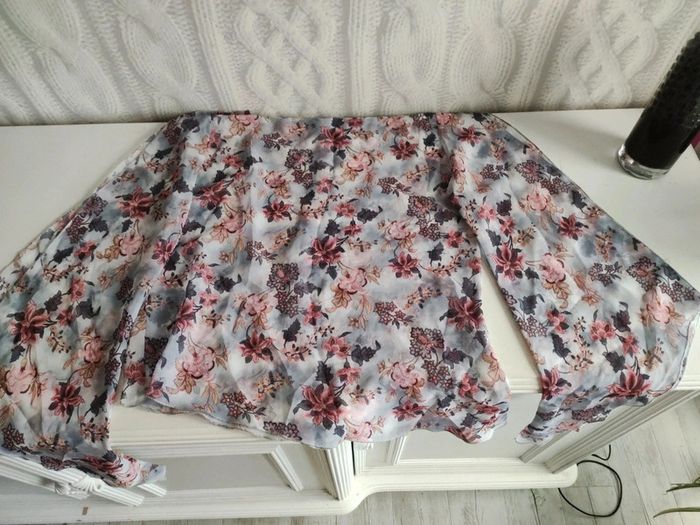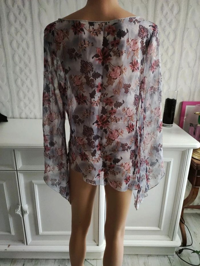 Bon état quelques petites taches blanches sur le vêtement au dos (dernière photo) manches très larges. top transparent et asymétrique sur le bas. bras ouverts. va de la taille 38 à 42 matière fluide #baronne40