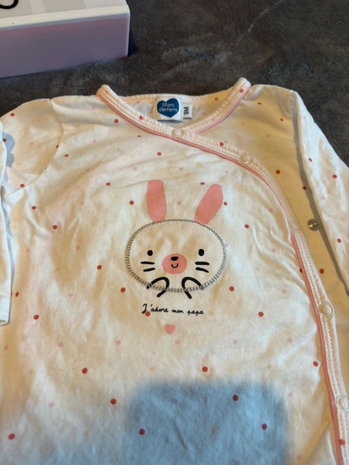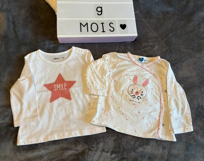 Lot de 2 t-shirts manches longues dont 1 avec une ouverture sur l’avant ☺️ Marque : Gémo / Mots d’enfants Taille : 9 mois Couleurs : blanc / rose 100% coton État : neufs ! Juste lavés ☺️ Envoi rapide 📬 N’hésitez pas a faire un tour dans mon dressing pour profiter des réductions pour l’achat d’un lot 🌺