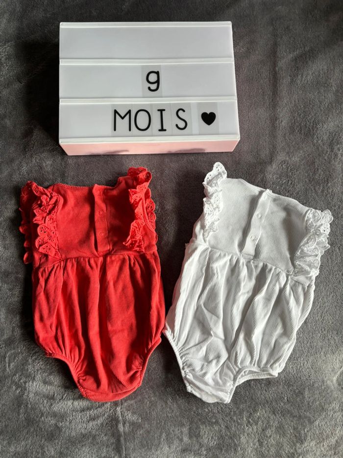 Lot de 2 grenouillères Marque : Kiabi Taille : 9 mois Couleurs : blanc et rouge ❤️🤍 État : comme neuves ! Très peu portées ! 🤩 Envoi rapide 📬 Tous les habits sont nettoyés avant l’envoi 😊 N’hésitez pas a faire un tour dans mon dressing pour profiter des réductions pour l’achat d’un lot 🌺