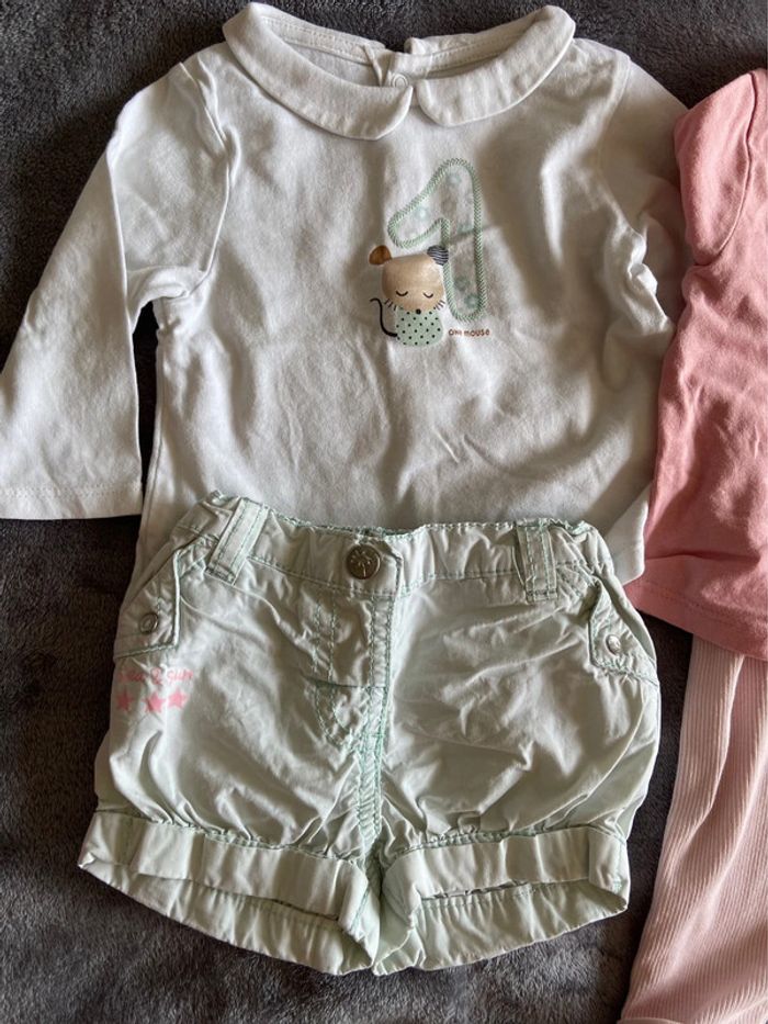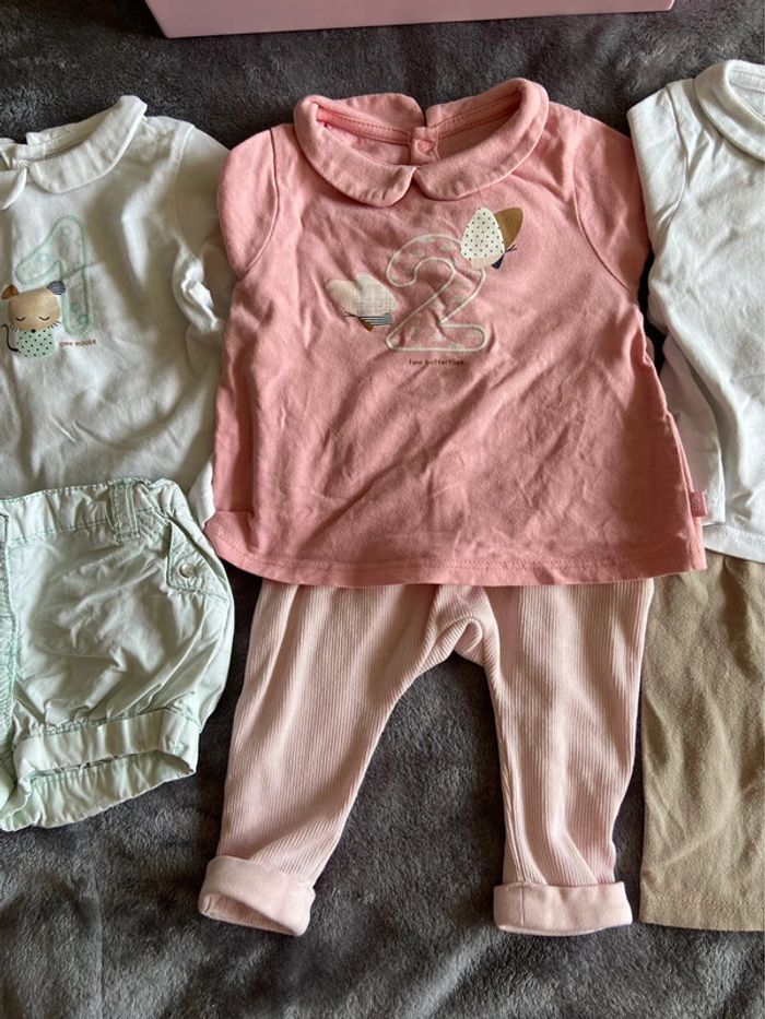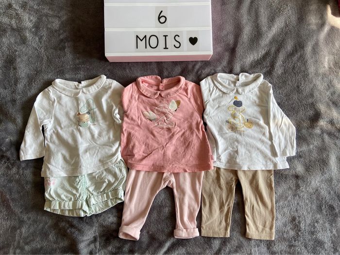 Lot de 3 tenues avec chiffre 😊 : 1 : short + t-shirt manches longues 2 : legging + t-shirt manches longues 3 : legging + t-shirt manches longues Couleurs : vert d’eau, blanc, rose, beige Marque : Obaïbi Taille : 6 mois État : très bon 😎 Envoi rapide 📬 Tous les habits sont nettoyés avant l’envoi 😊 N’hésitez pas a faire un tour dans mon dressing pour profiter des réductions pour l’achat d’un lot 🌺