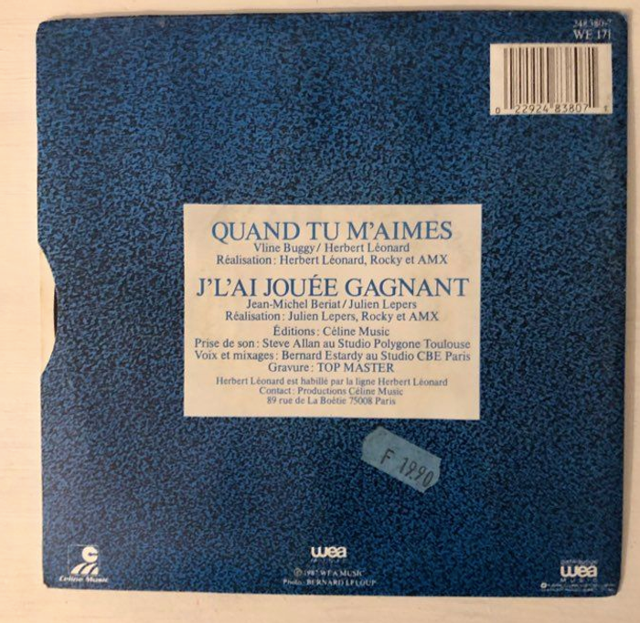 45 tours en bon état: testé et fonctionne 2483807 Sorti en France en 1987 Face A: quand tu m’aimes Face B: j’l’ai jouée gagnant