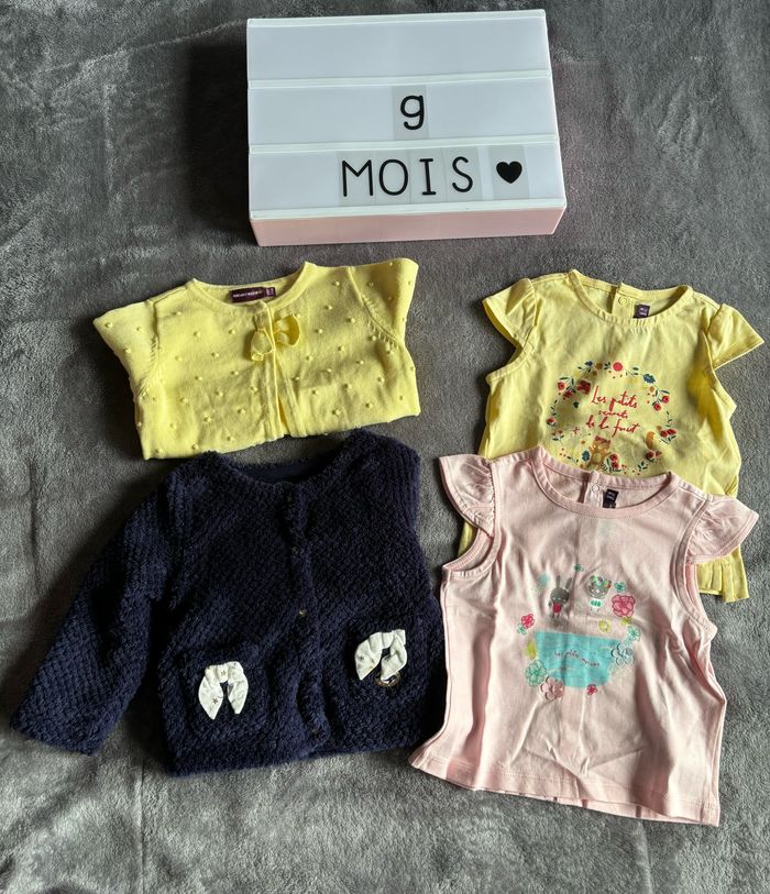Ensemble / lot comprenant : - 2 tshirts manches courtes - 1 veste chaude - 1 gilet boléro Marque : Sergent Major Édition limitée : Marine 🐳 🐚 Taille : 9 mois Couleurs : bleu marine / jaune / rose 💙💛🩷 État : neuf ! Articles jamais portés ! Envoi rapide 📬 N’hésitez pas a faire un tour dans mon dressing pour profiter des réductions pour l’achat d’un lot 🌺