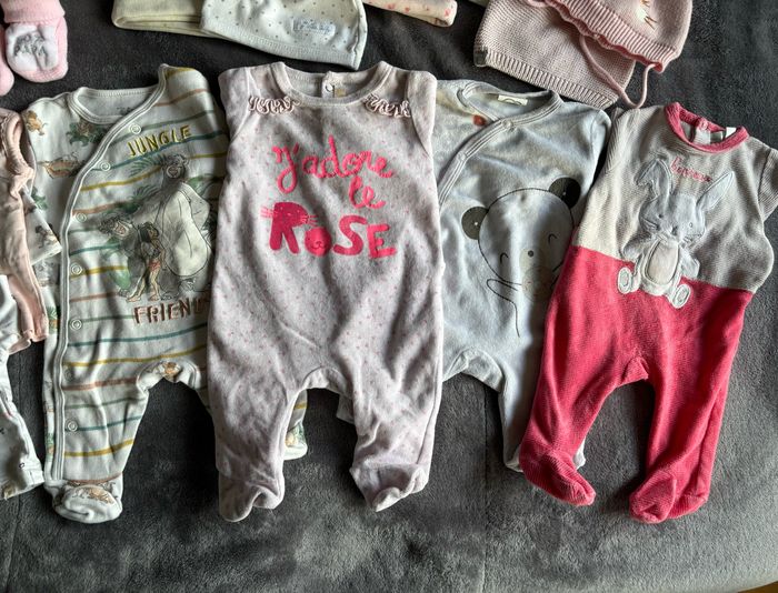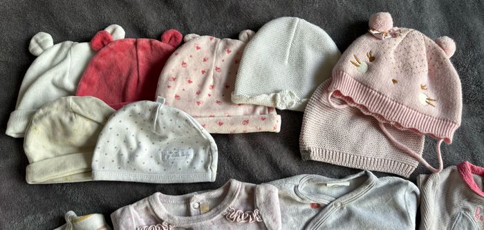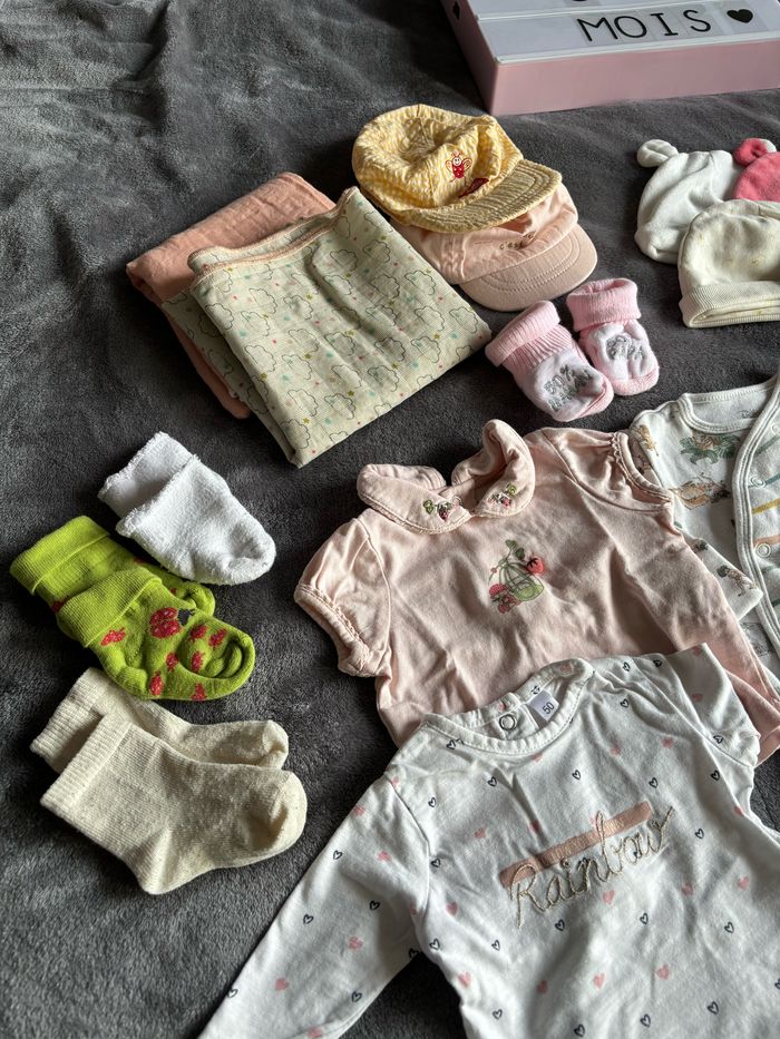 Lot de naissance comprenant : - 2 grands langes (neufs) 100% coton - 60 cm - 3 paires de chaussettes - 1 paire de chaussons (50% maman / 50% papa) (neuve) - 2 casquettes - 8 bonnets (naissance à 3 mois) - 1 t-shirt manches courtes Sergent Major (neuf) - 1 t-shirt manches longues (neuf) - 4 pyjamas dont un Disney (naissance + 1 mois) Plusieurs marques : Sergent Major, Kiabi, Disney, Petits cailloux… Le tout est en très bon état avec des pièces neuves ! 🤩 (Il me faut de la place dans mes placards alors je brade un peu 😅, il faut que ça parte 😂) Envoi rapide 📬 Tous les habits sont nettoyés avant l’envoi 😊 N’hésitez pas a faire un tour dans mon dressing pour profiter des réductions pour l’achat d’un lot 🌺