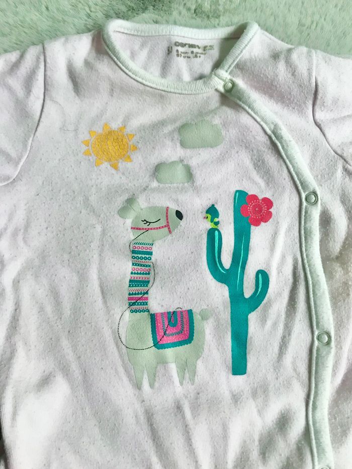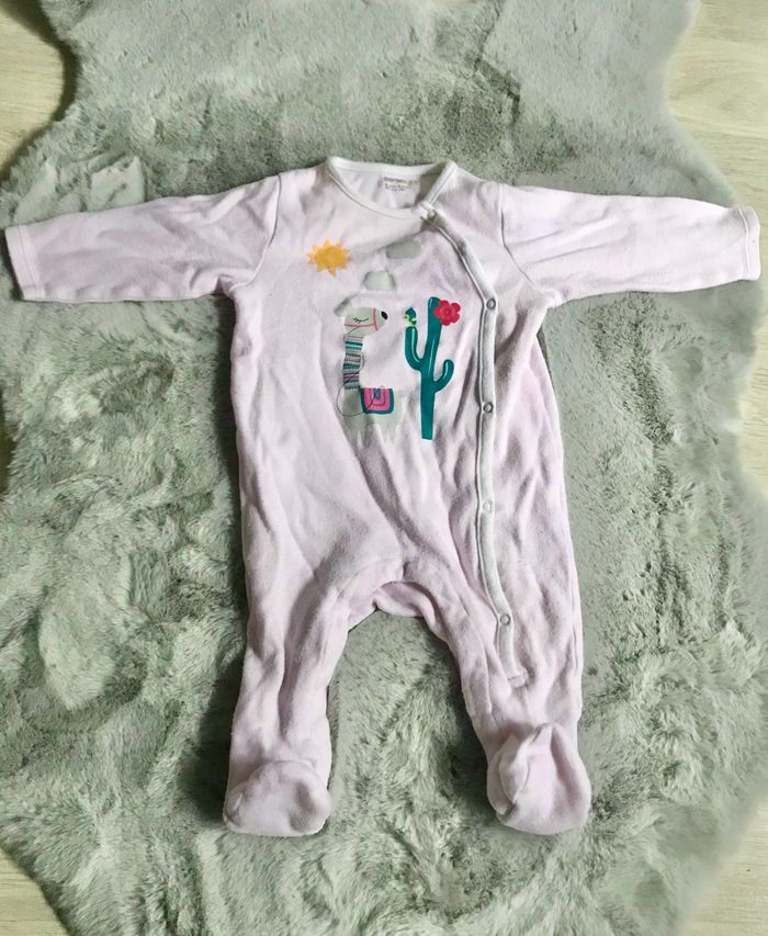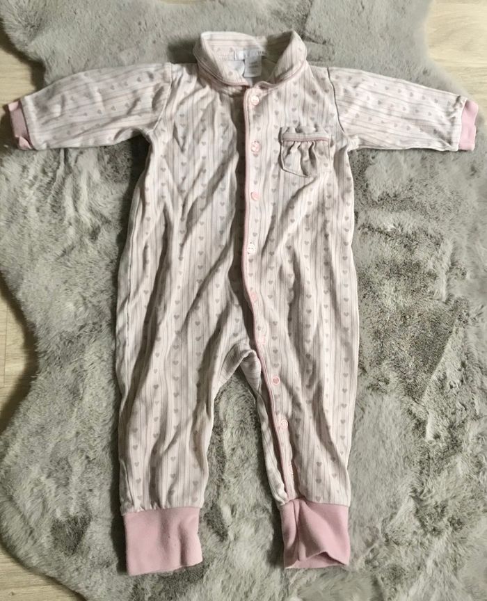 Grenouillère rose pâle à motif lama Ouverture par pressions à l’avant Orchestra Bouloches Pyjama rose et beige Motifs cœurs Ouverture par boutons et pressions à l’avant Petite tâche au dos (photo) Bouloches