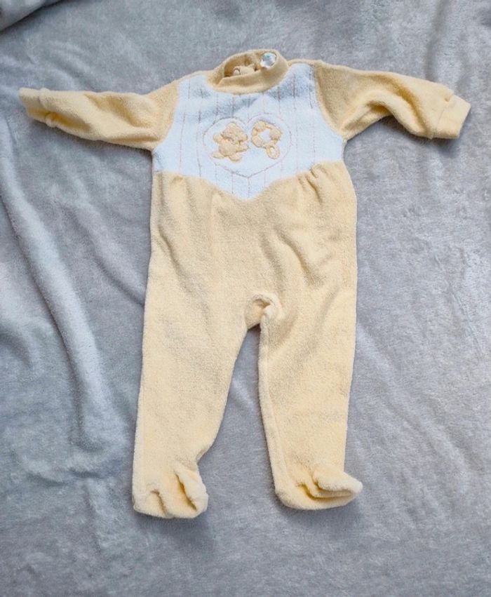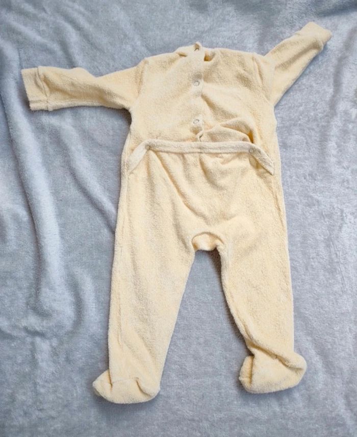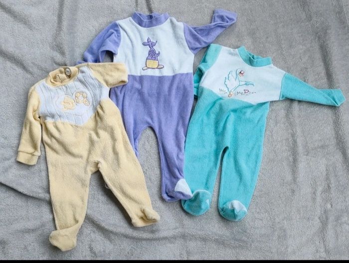 Lot de 3 pyjamas. -- pyjama jaune Taille : 6 mois Matière : 63 % coton et 32 % polyamide -- pyjama vert Taille : 6 mois Matière : 70 % coton et 30 % polyester. -- pyjama violet Taille : 6 mois Matière : 70 % coton et 30 % polyester.