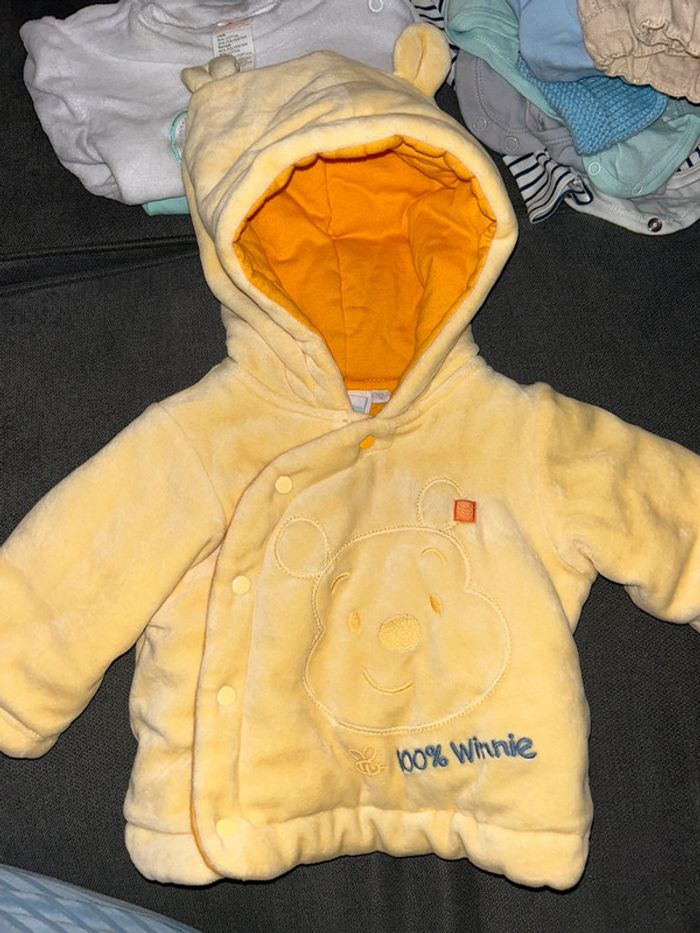 Veste Winnie l’ourson 1-3mois en très bon état jamais mise, sur la capuche y’a des oreille de Winnie elle et bien épaisse et toute douce