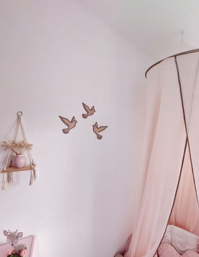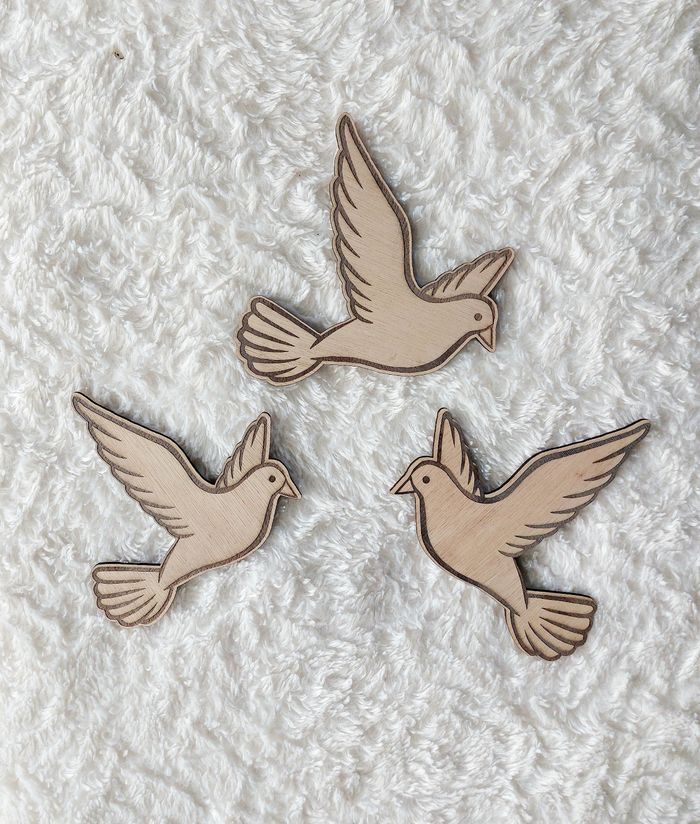 Ensemble 3 colombes en bois gravé Couleurs bois clair Artisanal envergure 25 cm environ Attache auto collante