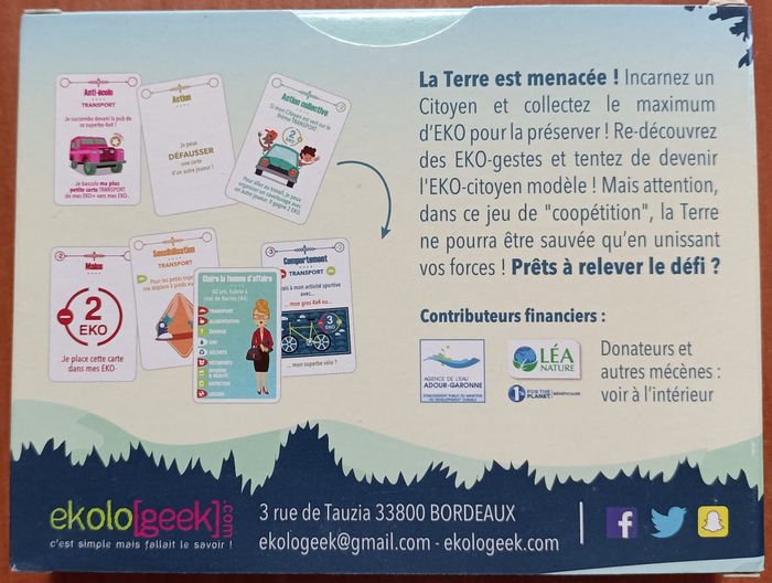 Jeu de cartes pédagogique sur les éco-gestes et la consommation responsable. La Terre est menacée, chaque joueur incarne un Citoyen et doit collecter un maximum de points EKO pour la préserver. À tour de rôle, ils piocheront un des six types de cartes : Comportements, Sensibilisation, Action Collective, Anti-ecolo, Action et Malus. 2016 entre 3 et 6 joueurs à partir de 10 ans 5 €