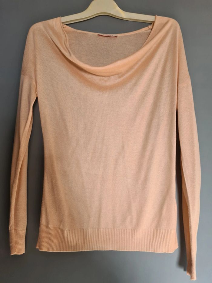 Pull léger col bénitier marque Camaïeu Bon état général, juste un très léger défaut devant : un fil tiré sur l'envers du tissu mais ce n'est pas troué. Coloris saumon clair Taille 2
