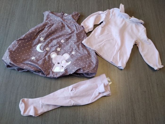 Ensemble robe rose/gris 6 mois : robe + Tee-shirt manches longues + collant 6/12 mois Non porté Ensemble robe mauve 6 mois : robe + Tee-shirt manches longues + collant Porté une ou deux fois (il y a une petite tache au niveau de col (voir dernière photo) #annebibi54_6mois