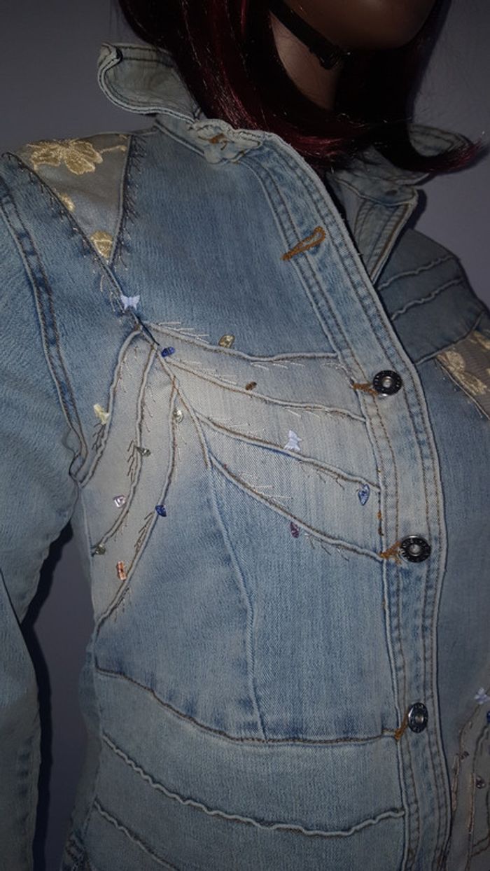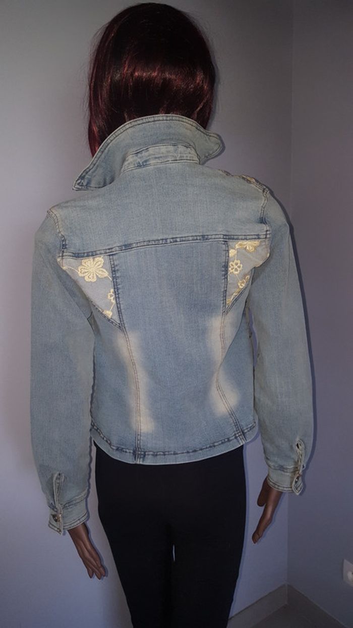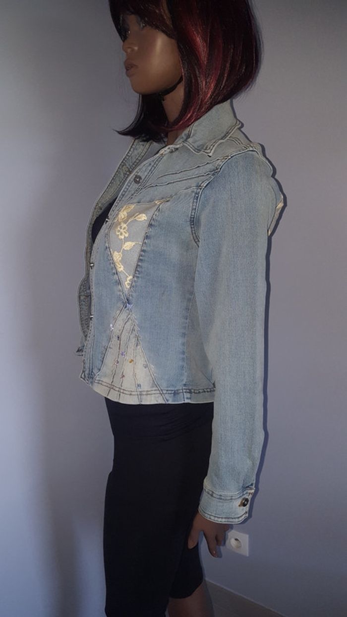 Superbe veste en jean femme très bien travaillé couleur jean délavé avec petite perle sur le devant et voile dentelle sur le haut et l'arrière taille M elle contient 2 % elasthane
