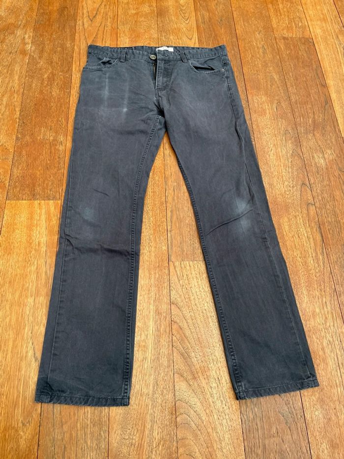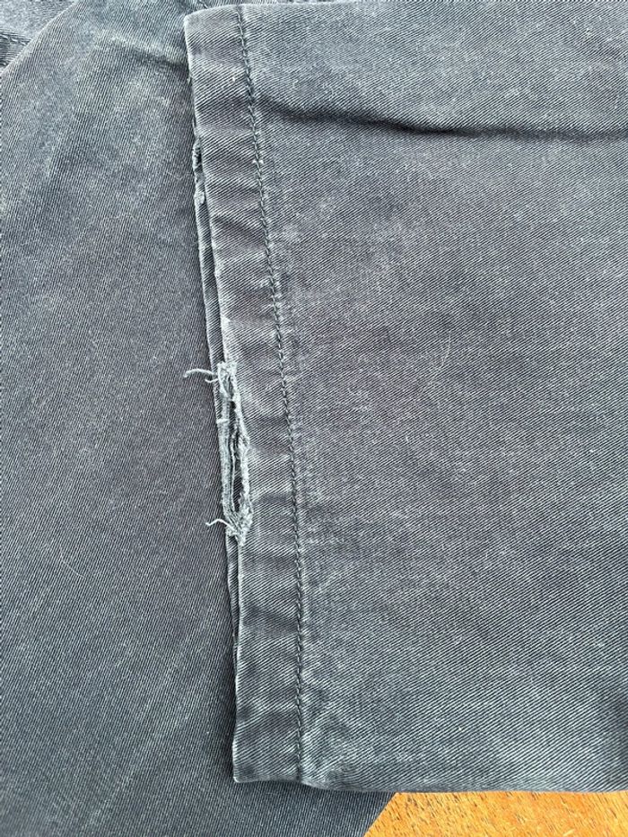 Chino légèrement usé, marque de portable sur la poche et blanchi sur les genoux. Légère usure du bas de jambe