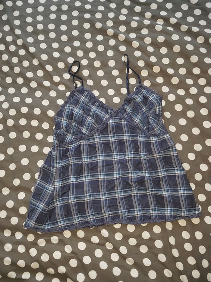 Top à carreaux bleu à fines bretelles matière fluide