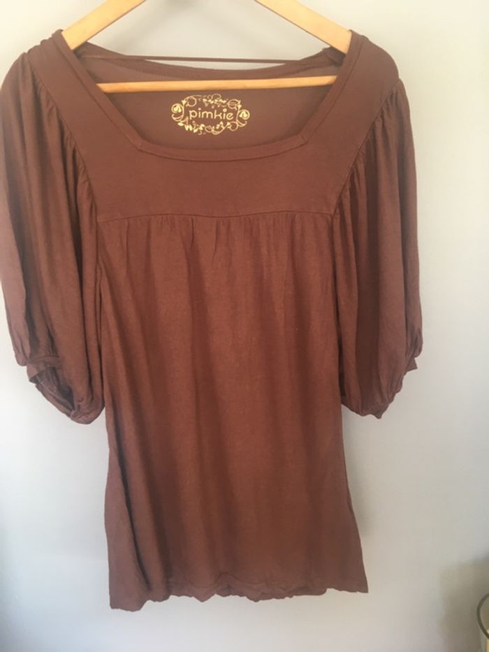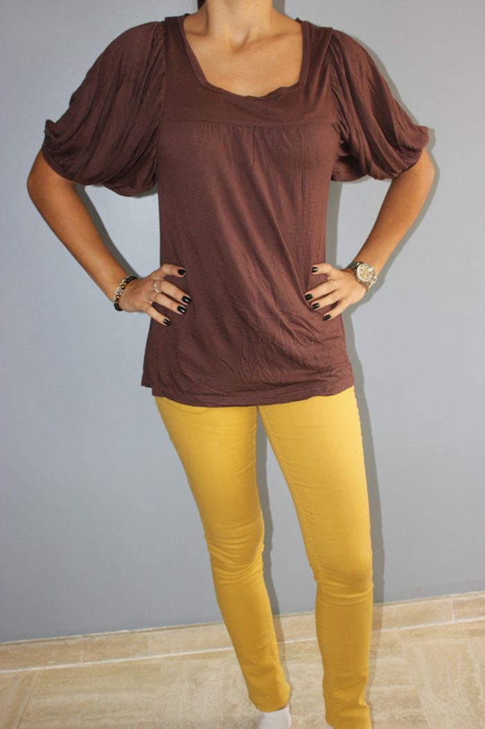 Bonjour, Je vends ce joli haut marron avec les manches styles bouffantes et 3/4. Se porte ample. Très bohème Il est en bon état Acheté chez Pimkie Taille S 🦋 a savoir : le pantalon moutarde porté t36 est également à vendre