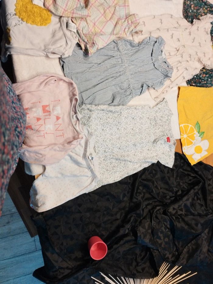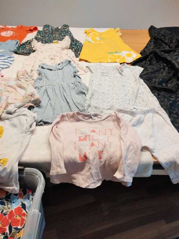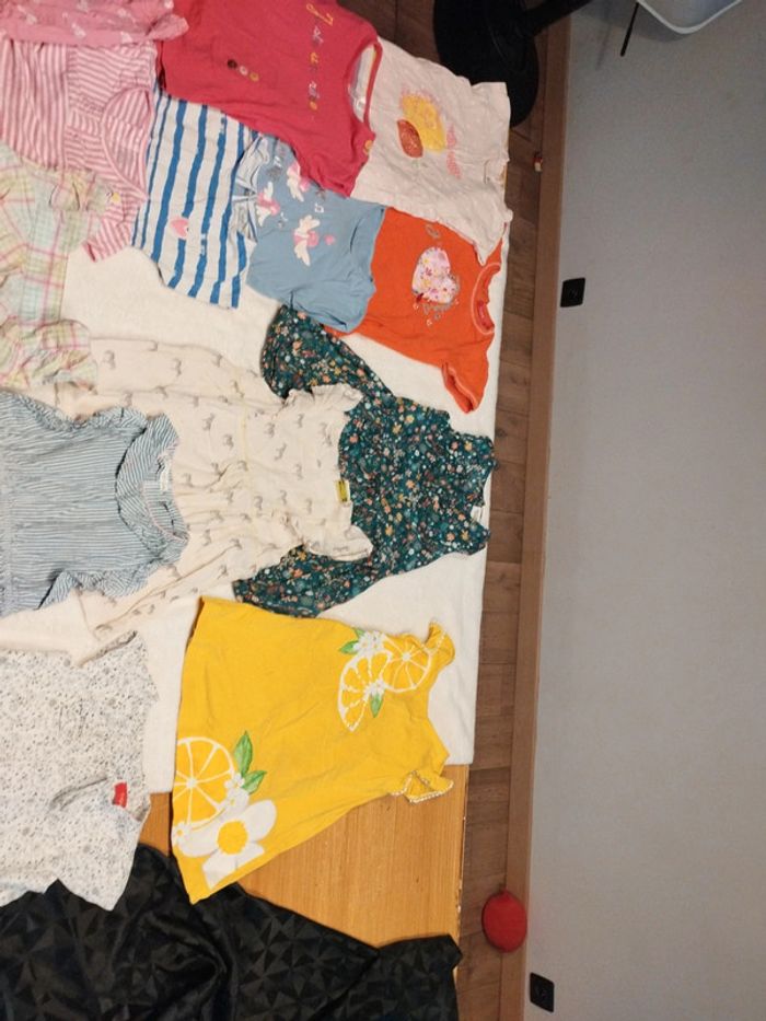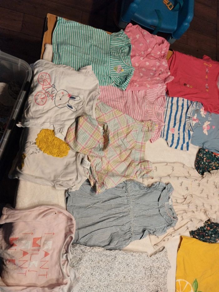 Bon état général taille 24 mois. Bon état général. J offre les deux tee shirt blanc et celui à carreaux et le pyjama deux pièces car petite tâche. Différentes marques,tissaia,tex liberto,tape à l'oeil, Mayoral,lulu castagnette etc