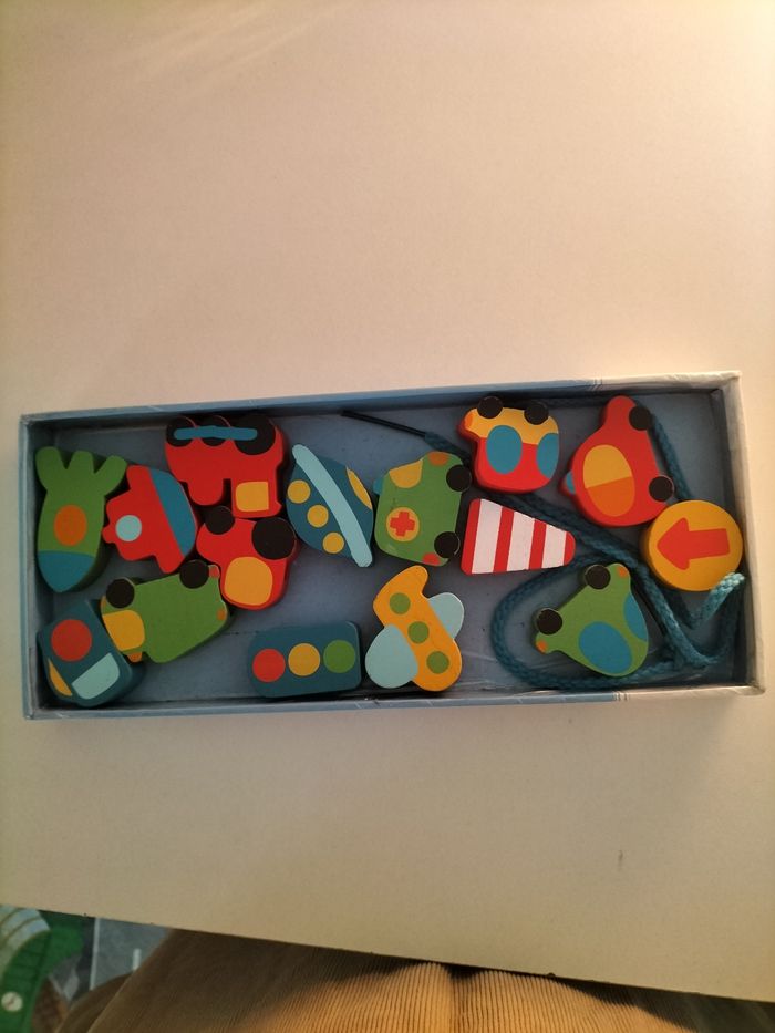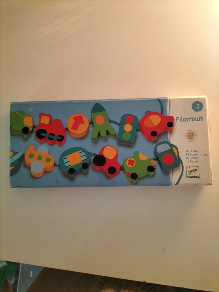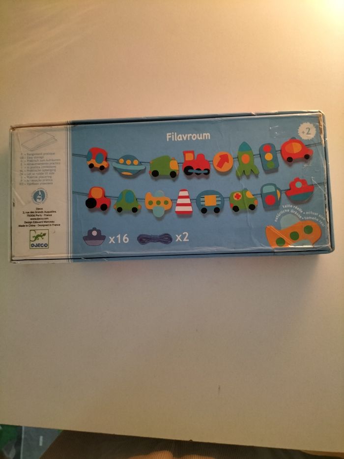 Jeu d'enfilement Filavroum. Manque une pièce et un fil. Je précise que la boîte était abîmée alors je l'ai re-scotché.