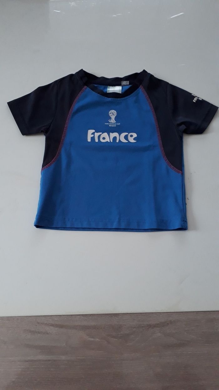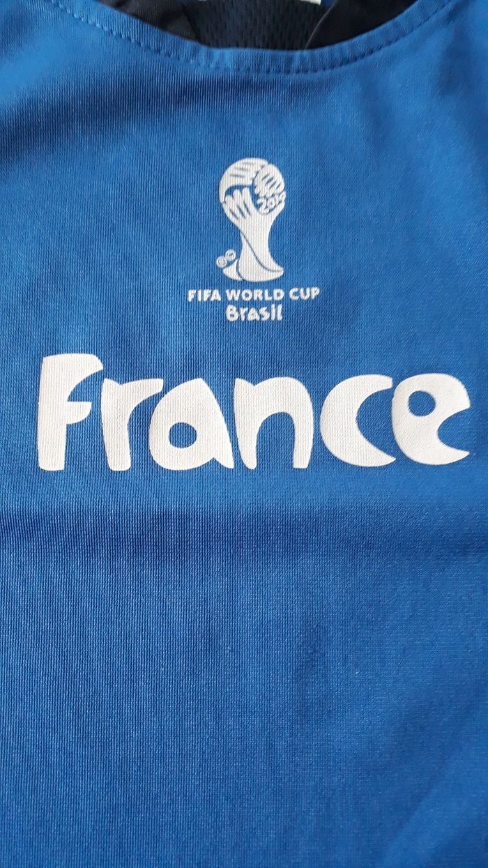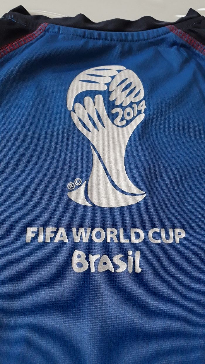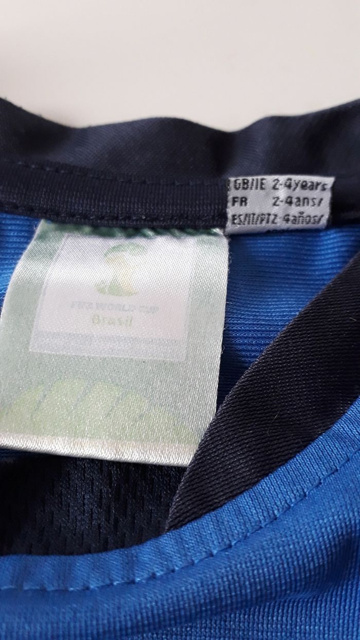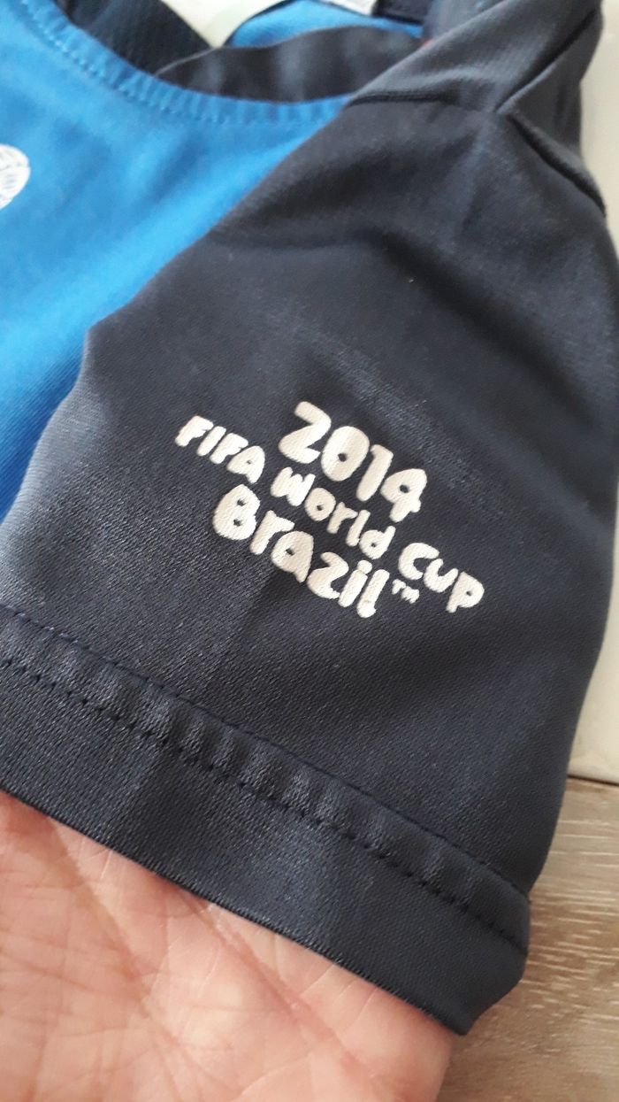 Tee shirt de foot de la coupe du monde de 2014. Flocage niquel A manche courte De couleur bleu clair et bleu foncé. Taille 4 ans