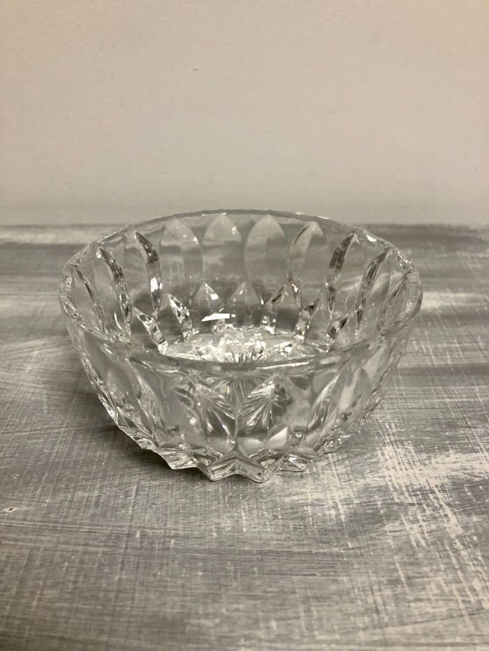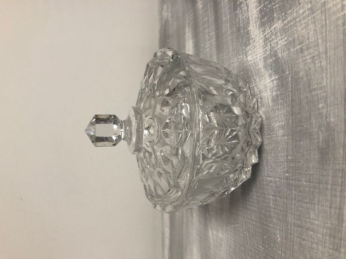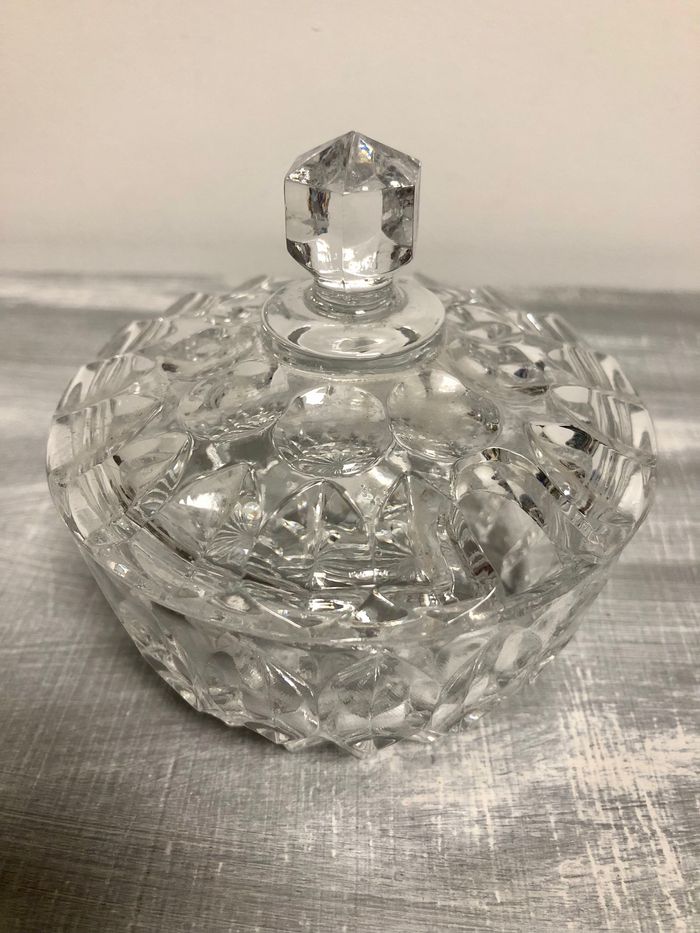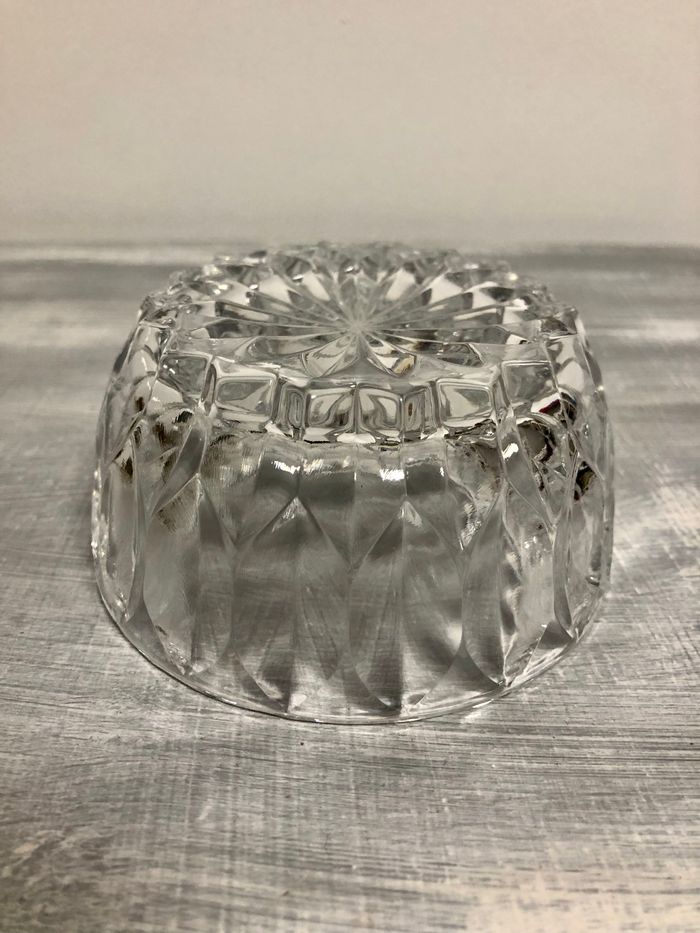 Vintage ancien adorable confiturier ou pot à moutarde En verre épais, finement ciselé En très bon état 9.7 cm de diamètre, 5 cm de hauteur pour la partie basse
